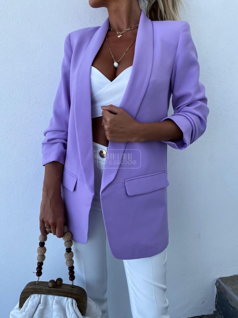 Elegantní sako jednoduchého vypasovaného střihu. Blejzr s dlouhými rukávy bez zapínání dokonale zvýrazní jakýkoli styling. Má poutka imitující kapsy. Pokud si ceníte elegance a extra třídy, tento blejzr je pro vás jako stvořený!