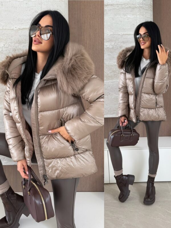 Krátká délka, prošívaná látka. Kožešinový lem. Kožešina je odnímatelná.