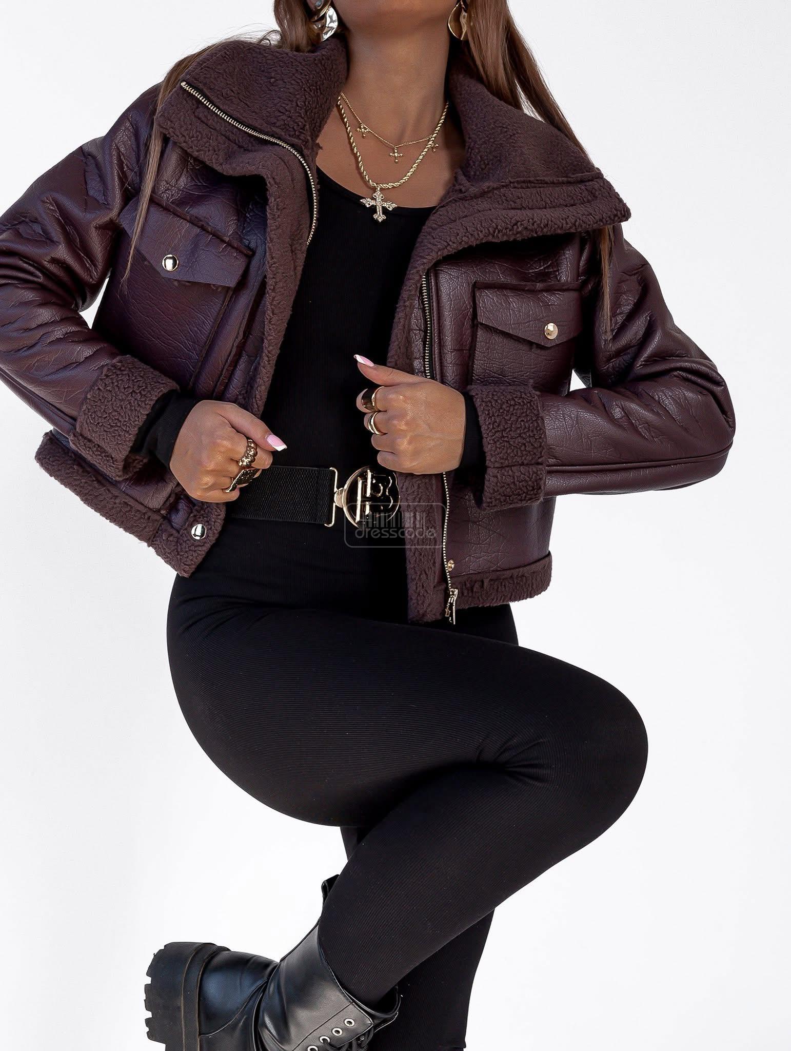 Tmavá barva činí z této bundy perfektní doplněk ke každému outfitu – od ležérních džín až po elegantní šaty. Měkká kožešinová podšívka a límec poskytují útulné teplo i v chladnějších dnech.