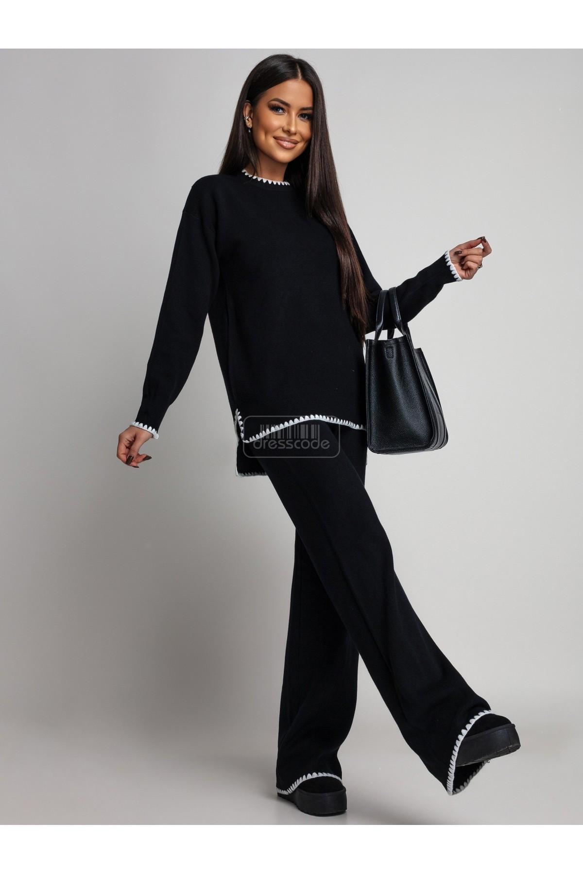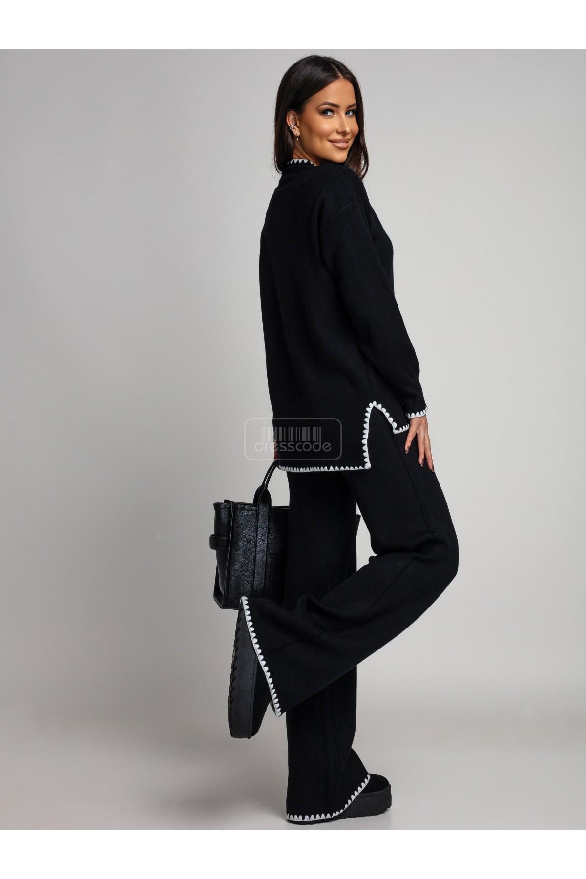 Svetr i kalhoty jsou zdobeny vyšívaným lemem.