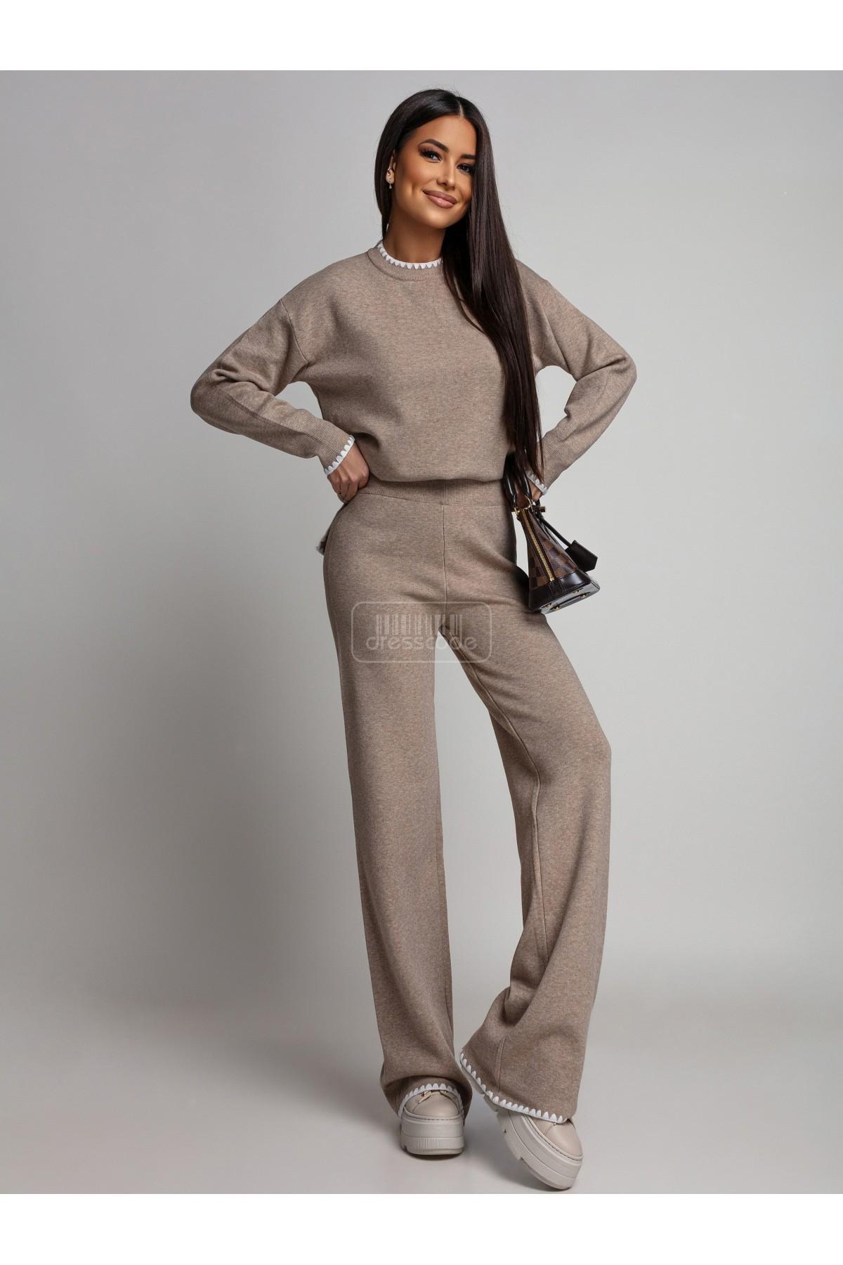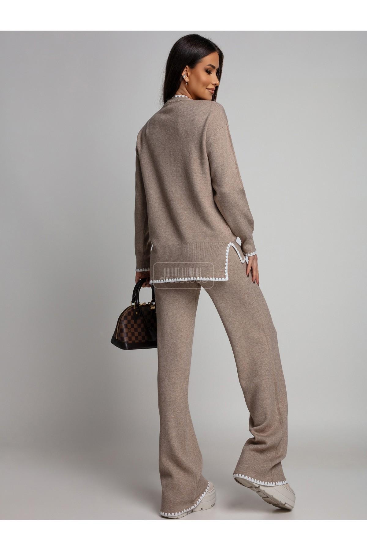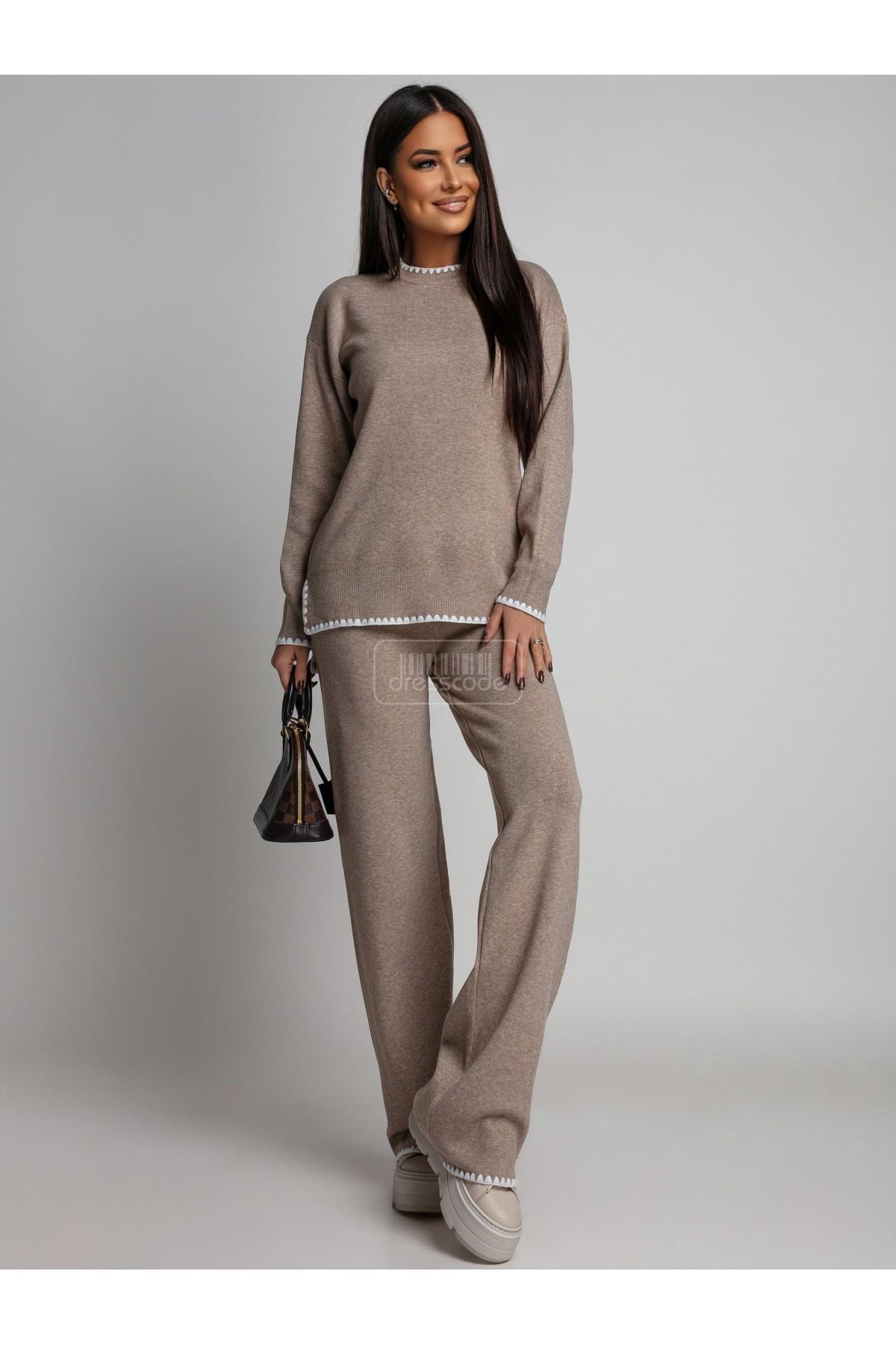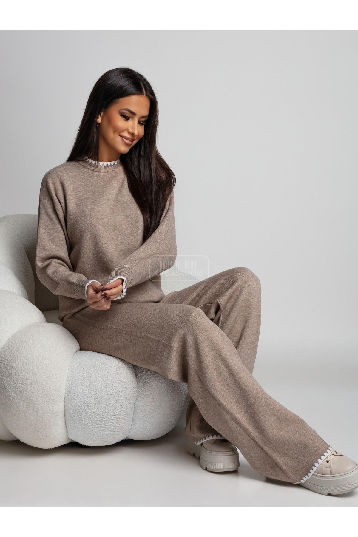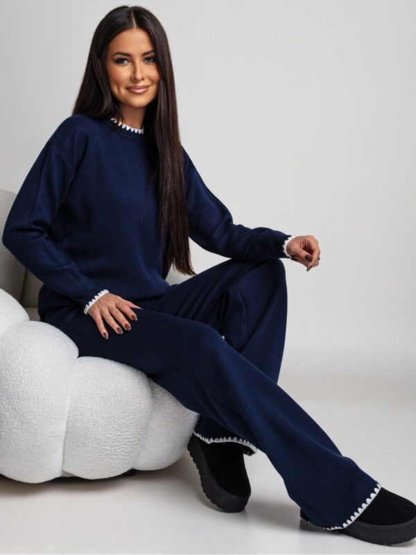 Svetr i kalhoty jsou zdobeny vyšívaným lemem.