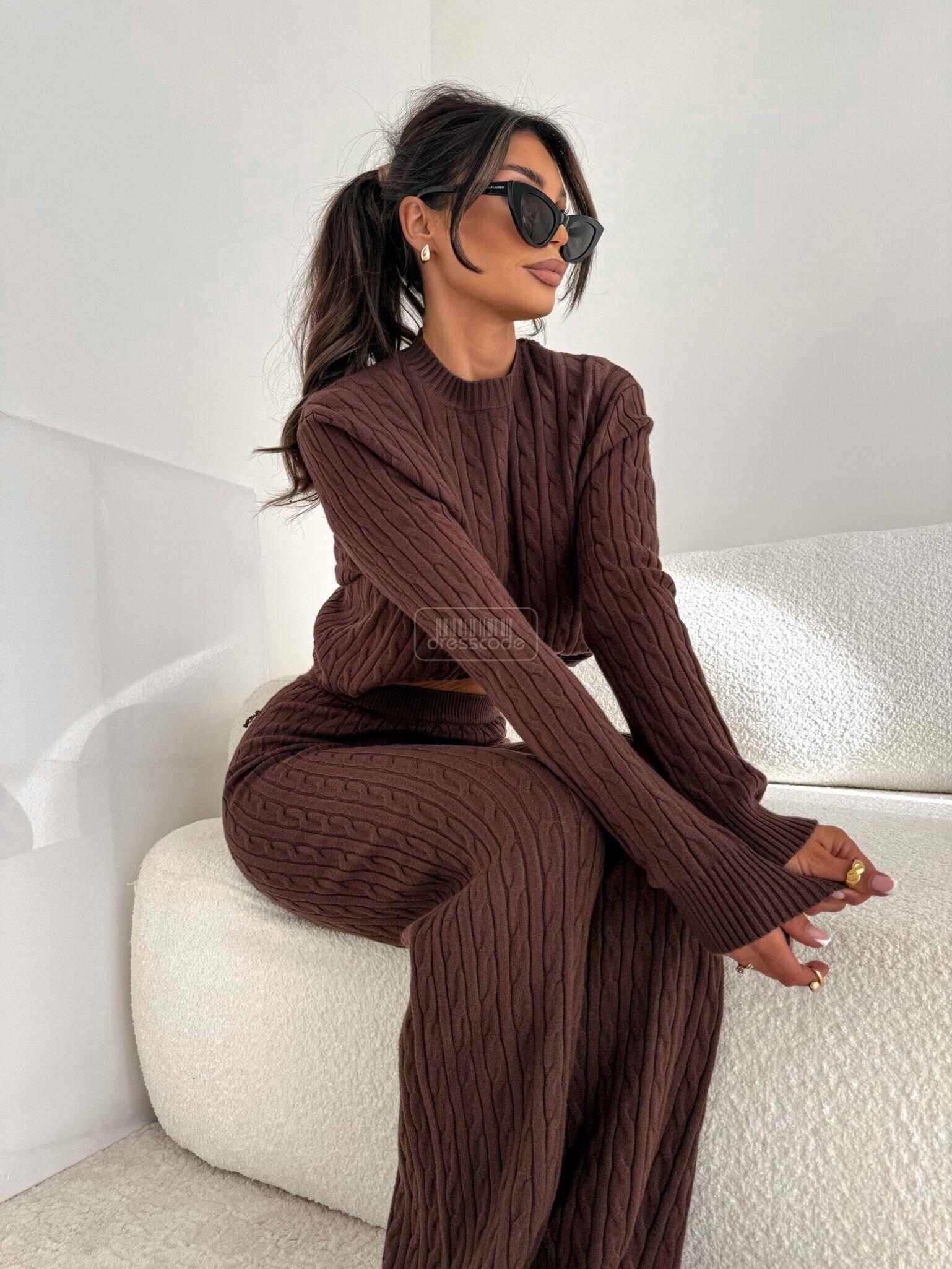 Stylová pletená souprava 2 v 1, vyrobená z měkké, příjemné na dotek pleteniny s copánkovým vzorem. Skládá se z volného svetru a pohodlných rozšířených kalhot. Ideální pro každodenní nošení, práci na dálku, cestování nebo setkání a nabízí pohodlný a zároveň elegantní styl.