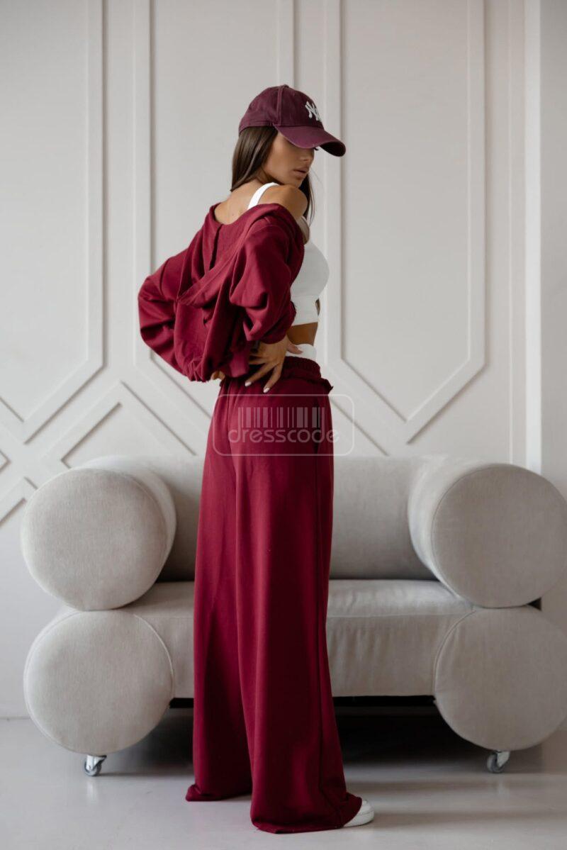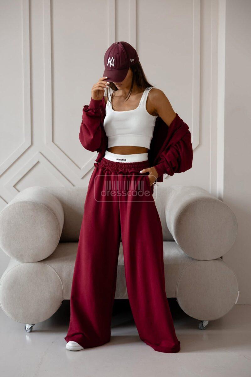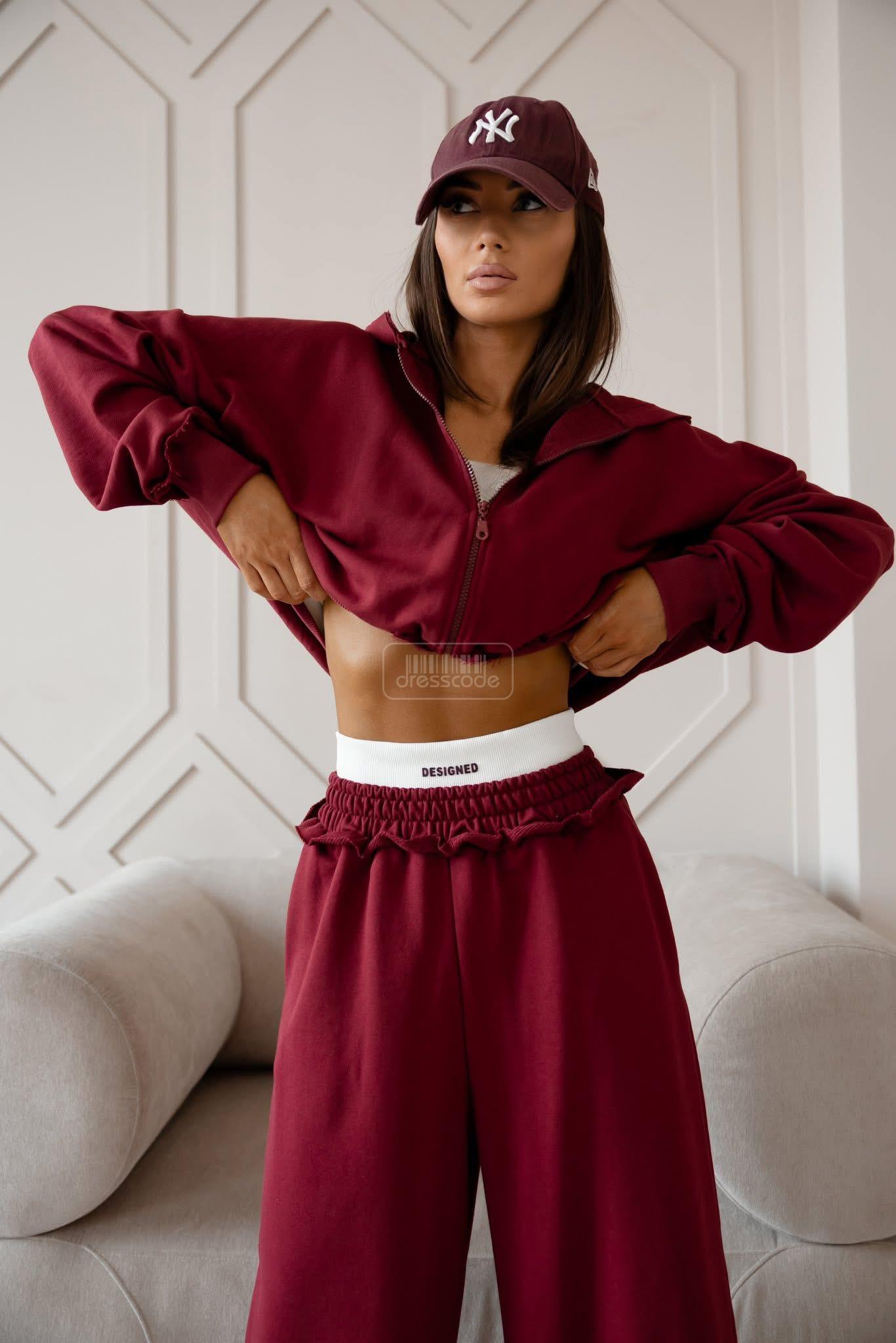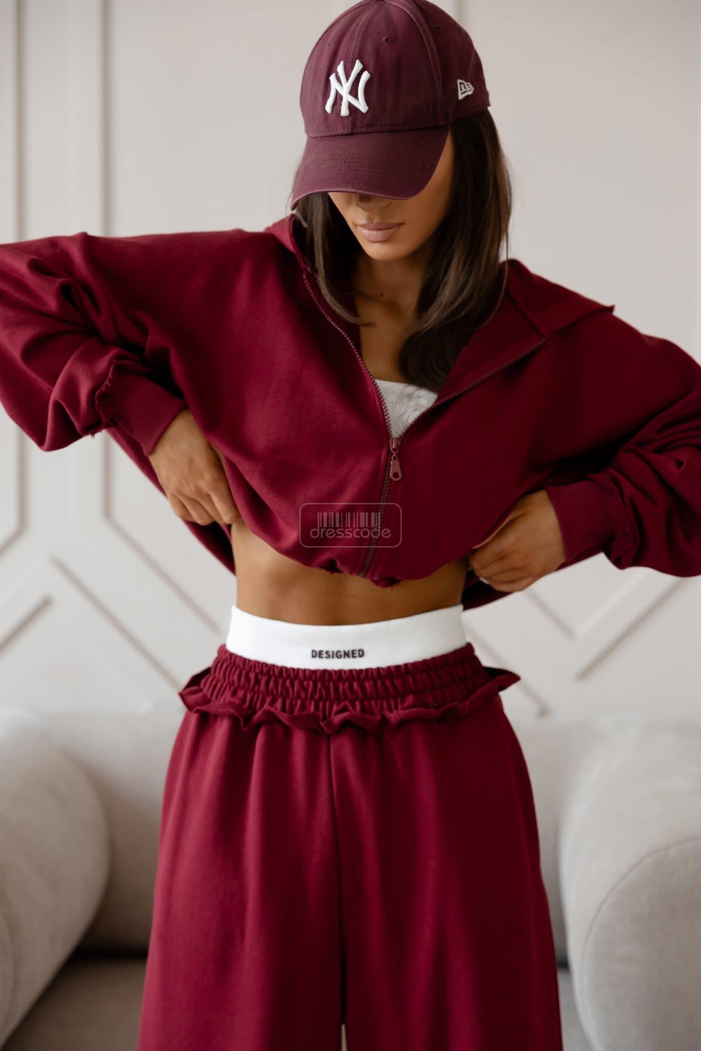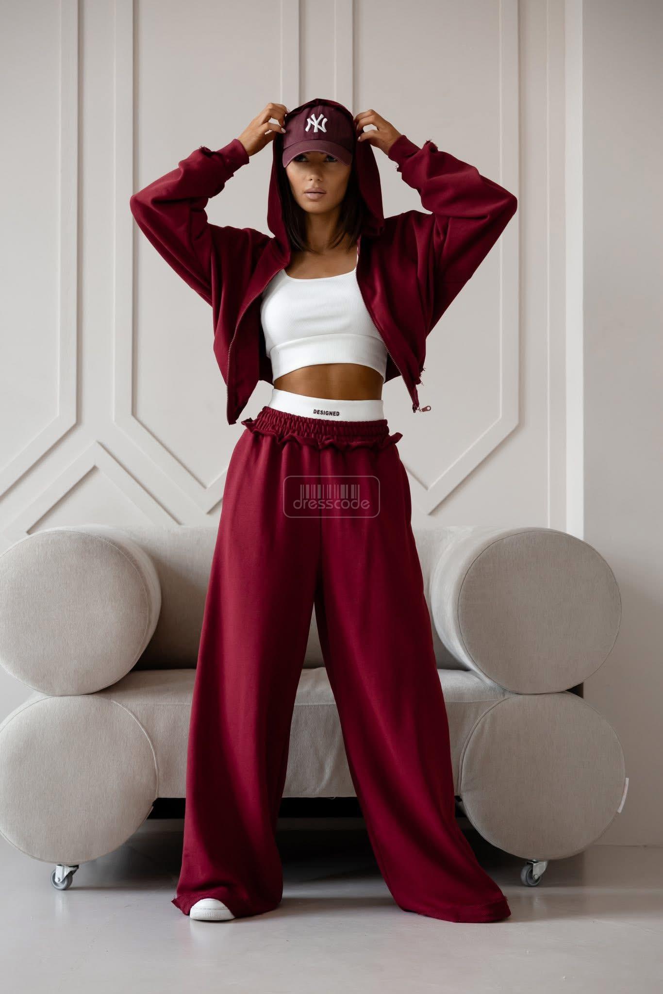 Třídílná tepláková souprava je vyrobena z vysoce kvalitní elastické bavlněné látky. Mikina oversize je zkrácený model s kapucí. Zapíná se na zip a má žebrované manžety a lem. Žebrovaný top se čtvercovým výstřihem je krátký a perfektně sedí. Kalhoty mají žebrovaný vrch s minimalistickým potiskem a elastickým pasem. Tento střih s vysokým pasem se vyznačuje širokými kalhotami s neopracovaným lemem.