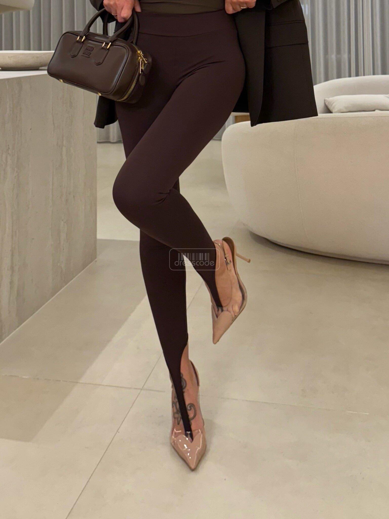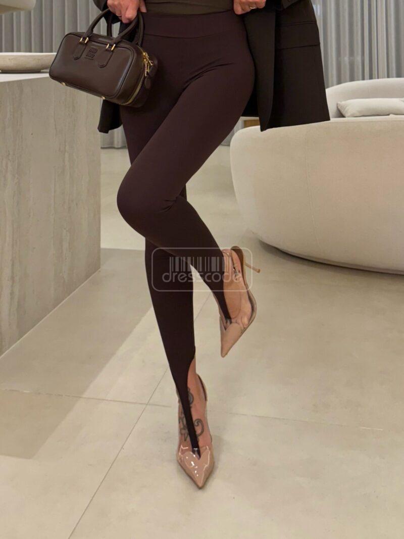 Hladký povrch, elastická tkanina. Středně vysoký střih. Široké kalhoty.