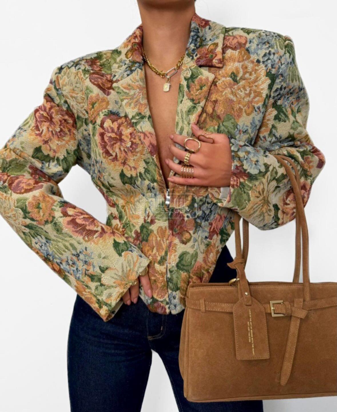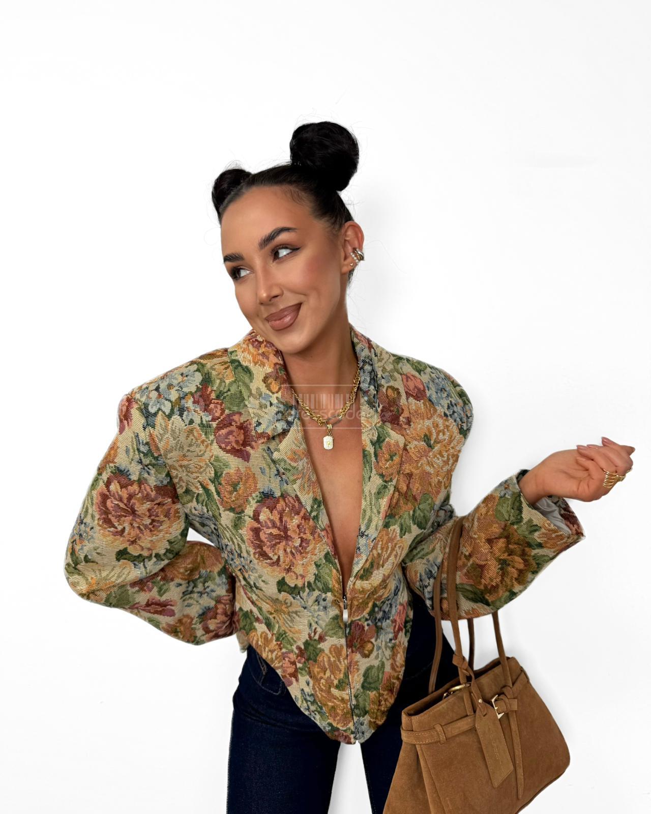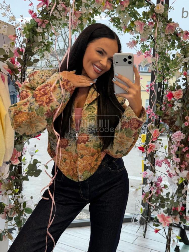Stylové sako s květinovým potiskem. Jeho úzký střih krásně zvýrazňuje siluetu, zatímco klasický límec a zapínání na zip dodávají eleganci. Výrazný potisk v teplých, přírodních barvách činí toto sako ideálním pro každodenní nošení i pro elegantnější outfity. Hodí se k džínám, kalhotám s vysokým pasem nebo sukni.