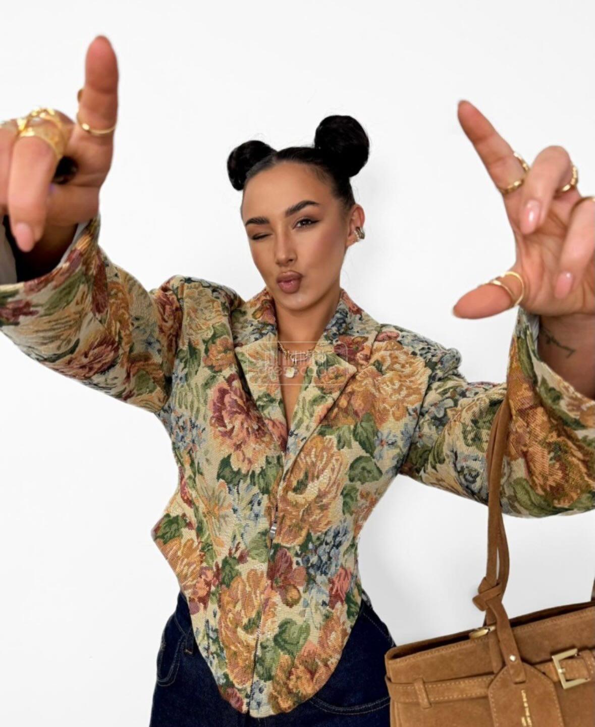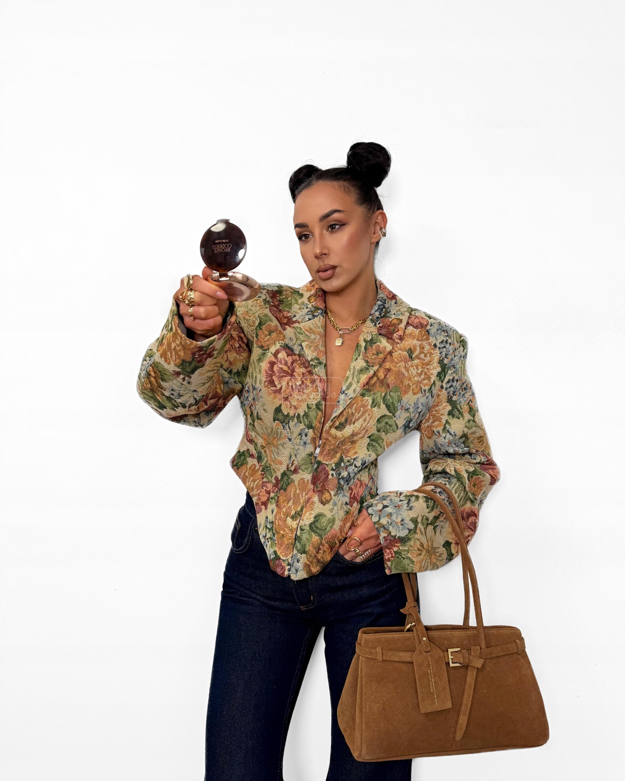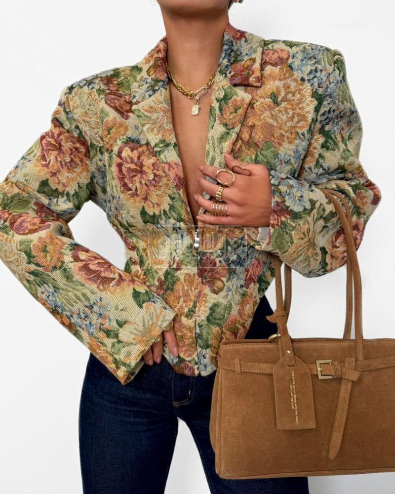 Stylové sako s květinovým potiskem. Jeho úzký střih krásně zvýrazňuje siluetu, zatímco klasický límec a zapínání na zip dodávají eleganci. Výrazný potisk v teplých, přírodních barvách činí toto sako ideálním pro každodenní nošení i pro elegantnější outfity. Hodí se k džínám, kalhotám s vysokým pasem nebo sukni.