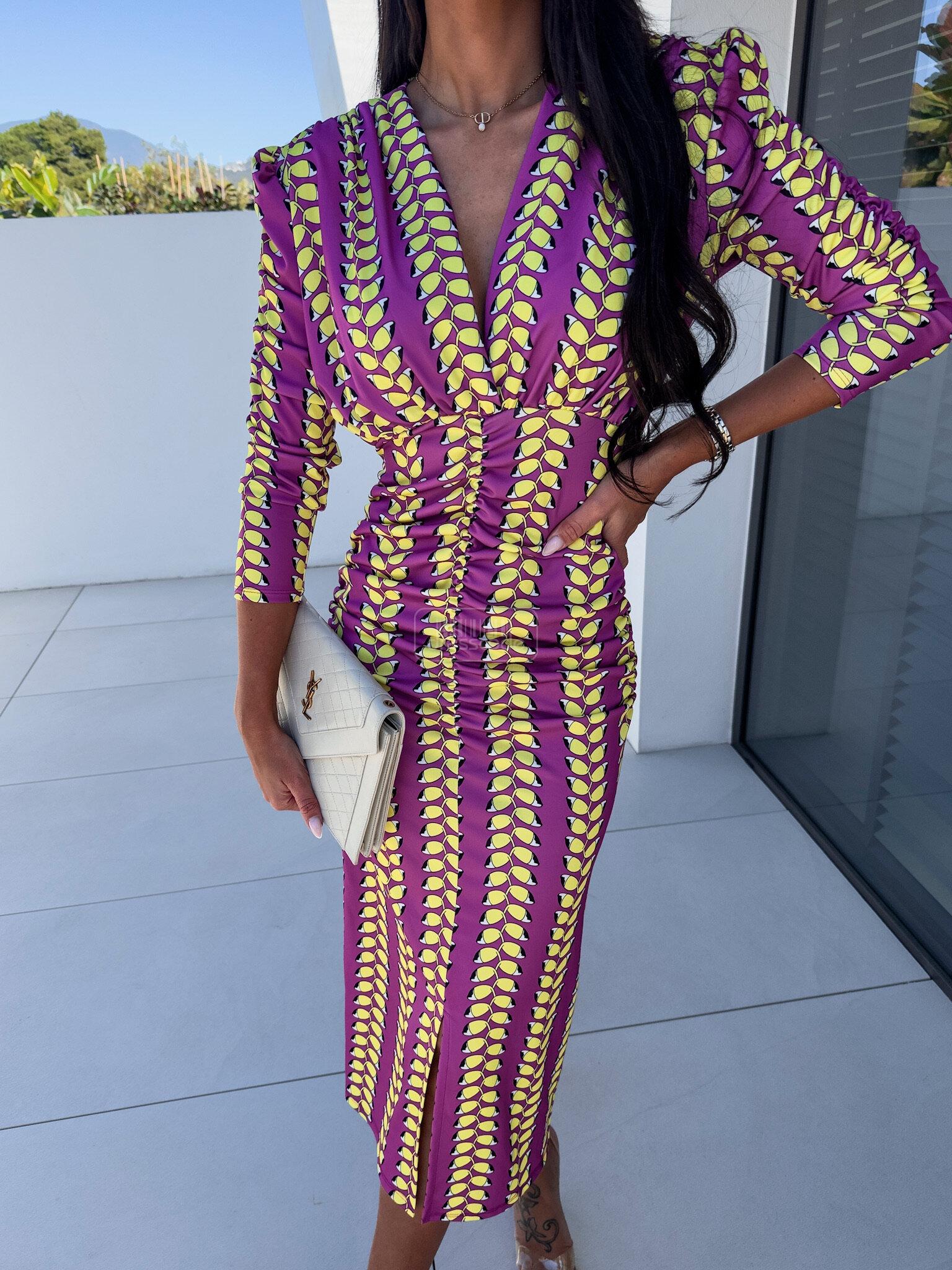 Šaty vynikají ženským střihem, výrazným potiskem a použitím nařaseného materiálu, díky kterému budou odhaleny přednosti vaší postavy. Jeho hladký, pružný materiál se dokonale přizpůsobí vaší postavě. Délka bude vhodná pro fanoušky midi. Nafouklé, zúžené rukávy a výstřih do V jsou vlastnosti, které nepochybně popisují tento model.