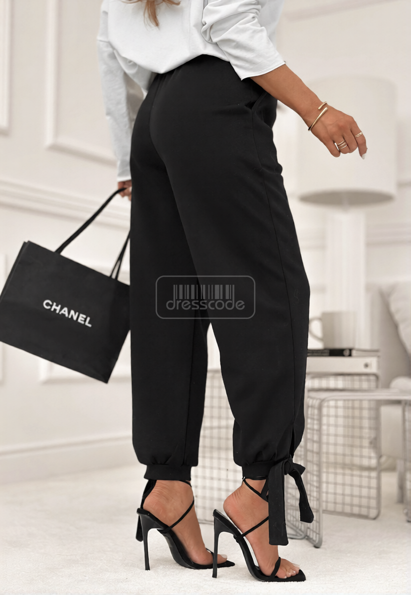 Měkké tepláky z hladké, splývavé viskózové látky. Mají klasický střih s elastickým pasem se stahovací šňůrkou a předními kapsami. Dlouhé kalhoty jsou zakončeny nastavitelnou mašlí.