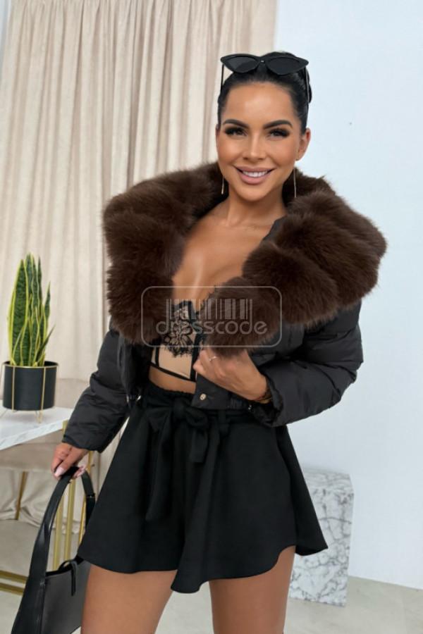 – Krátká černá péřová bunda se světlým kožešinovým lemem