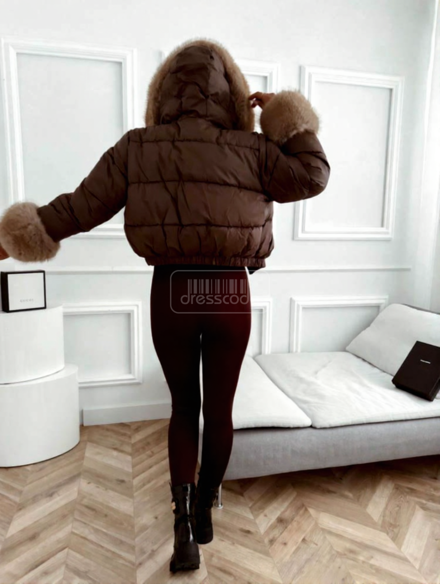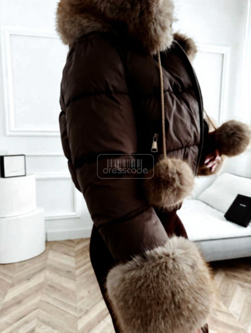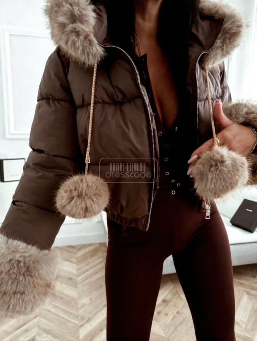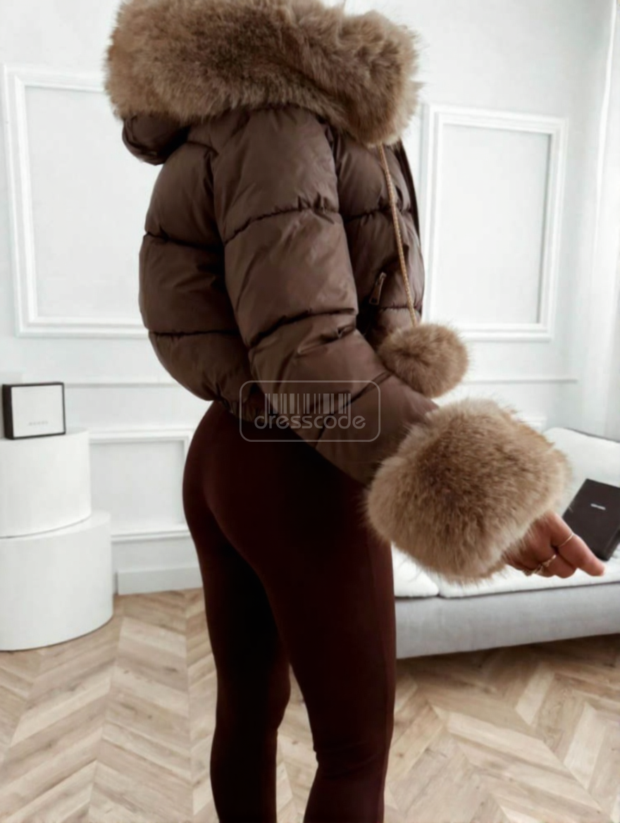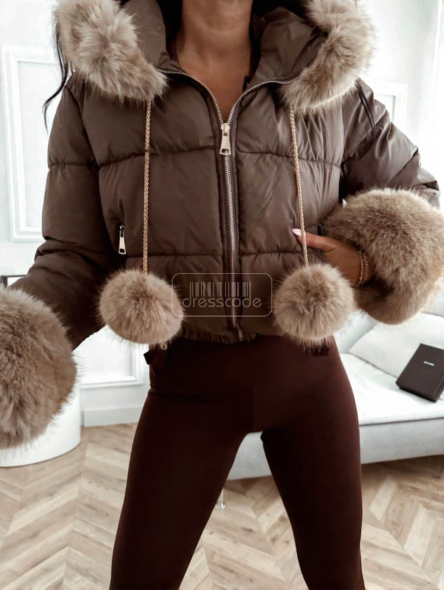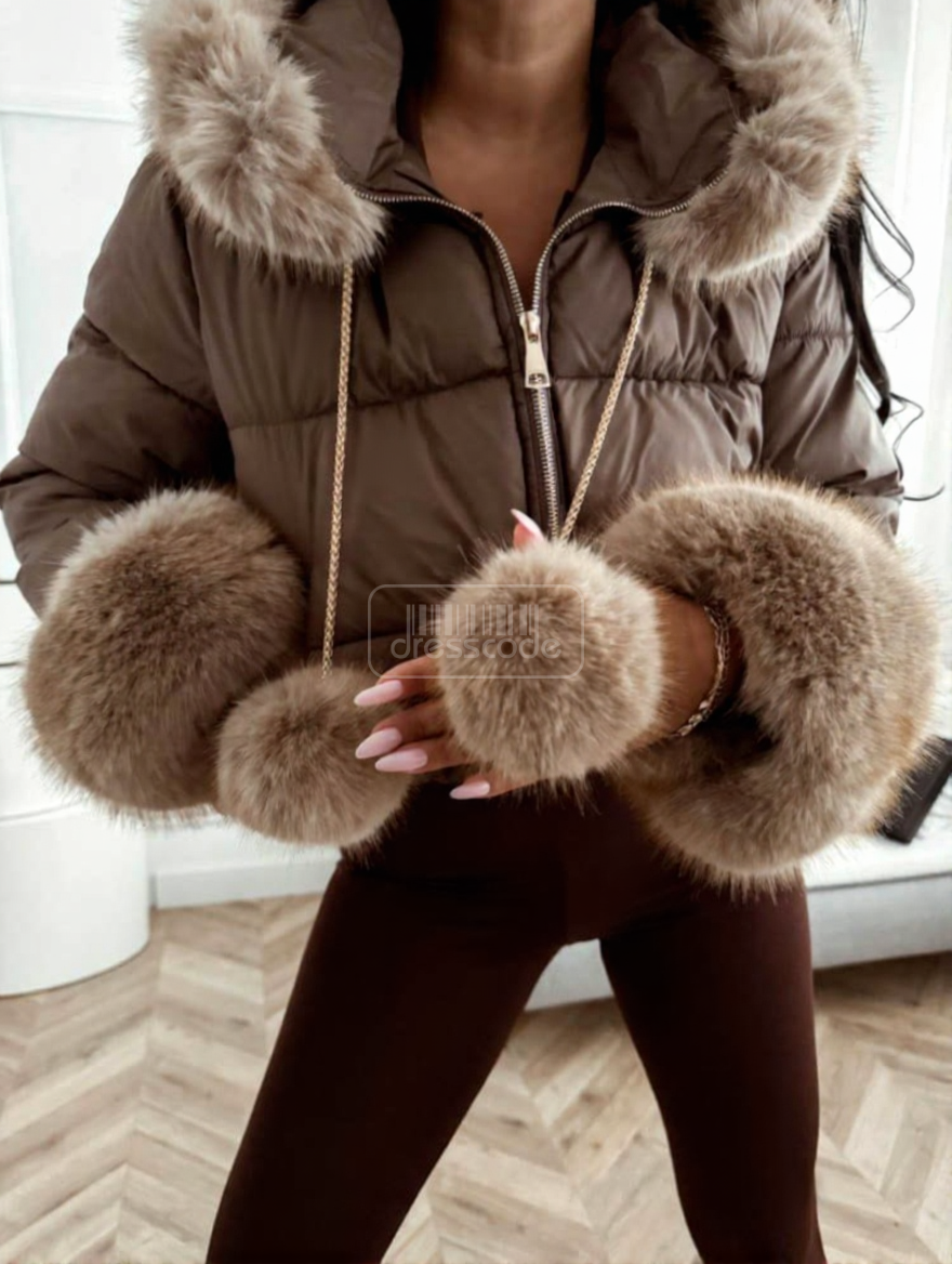 Tato čokoládově zbarvená bunda s béžovou umělou kožešinou je stylovou volbou pro podzimní a zimní sezónu. Její krátký, zvýrazněný pas krásně tvaruje siluetu, zatímco nadýchaný lem kolem kapuce a rukávů jí dodává elegantní a ženský nádech. Vyrobený z lehkého, zatepleného materiálu, tento kousek účinně chrání před chladem a zároveň si zachovává moderní vzhled. Béžová umělá kožešina je měkká, příjemná na dotek a vypadá neuvěřitelně stylově. Zlaté detaily v podobě zipu a ozdobných šňůrek dodávají módní nádech. Tato bunda je ideální pro městský styl – dobře se hodí k legínám, kozačkám nebo kotníkovým botám.