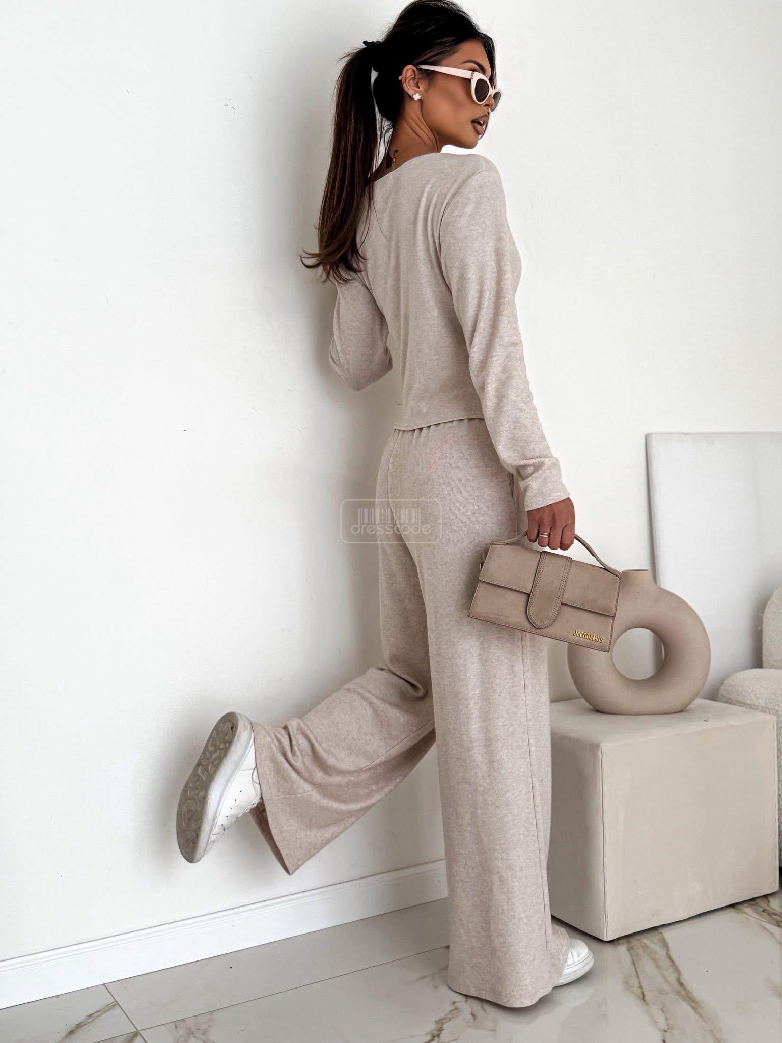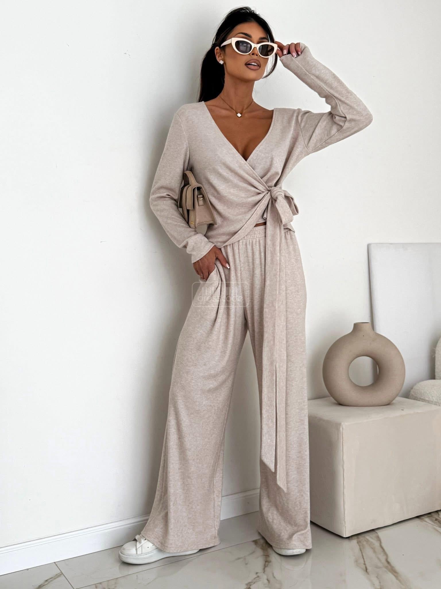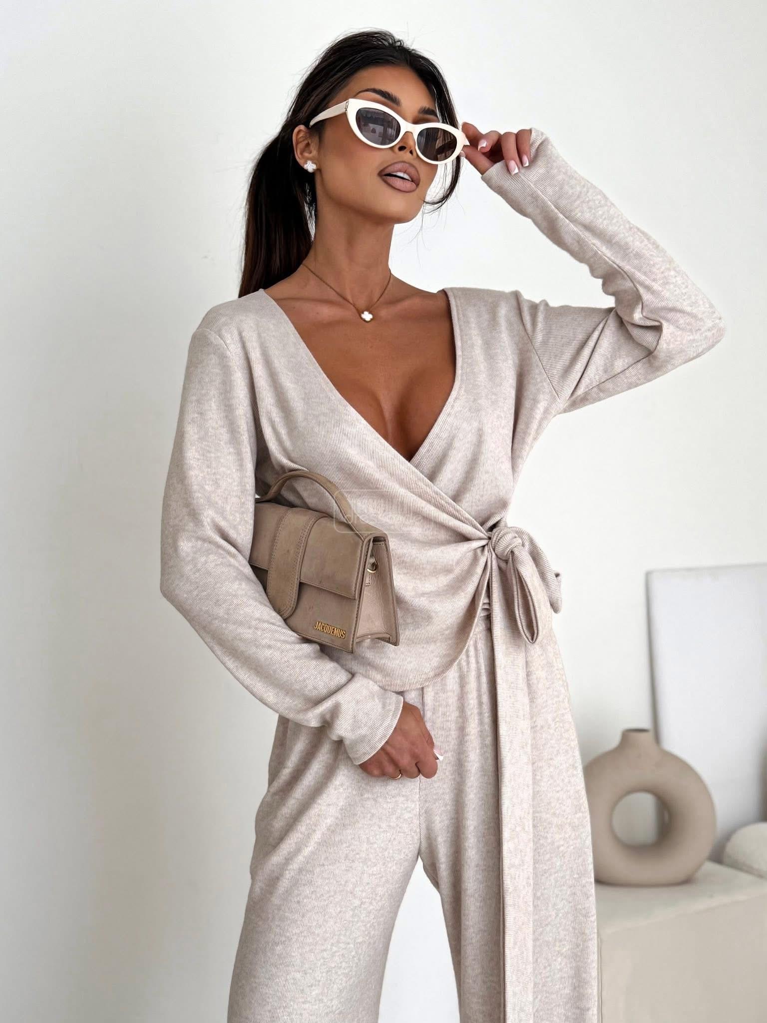 Elegantní a zároveň neuvěřitelně pohodlná sada, která kombinuje ženský styl s pohodlím. Zavinovací halenka s vázáním decentně zvýrazňuje pas a výstřih, zatímco široké kalhoty s vysokým pasem poskytují svobodu pohybu a lichotivou siluetu. Ideální pro každodenní nošení i pro speciální příležitosti – stačí vyměnit doplňky.
