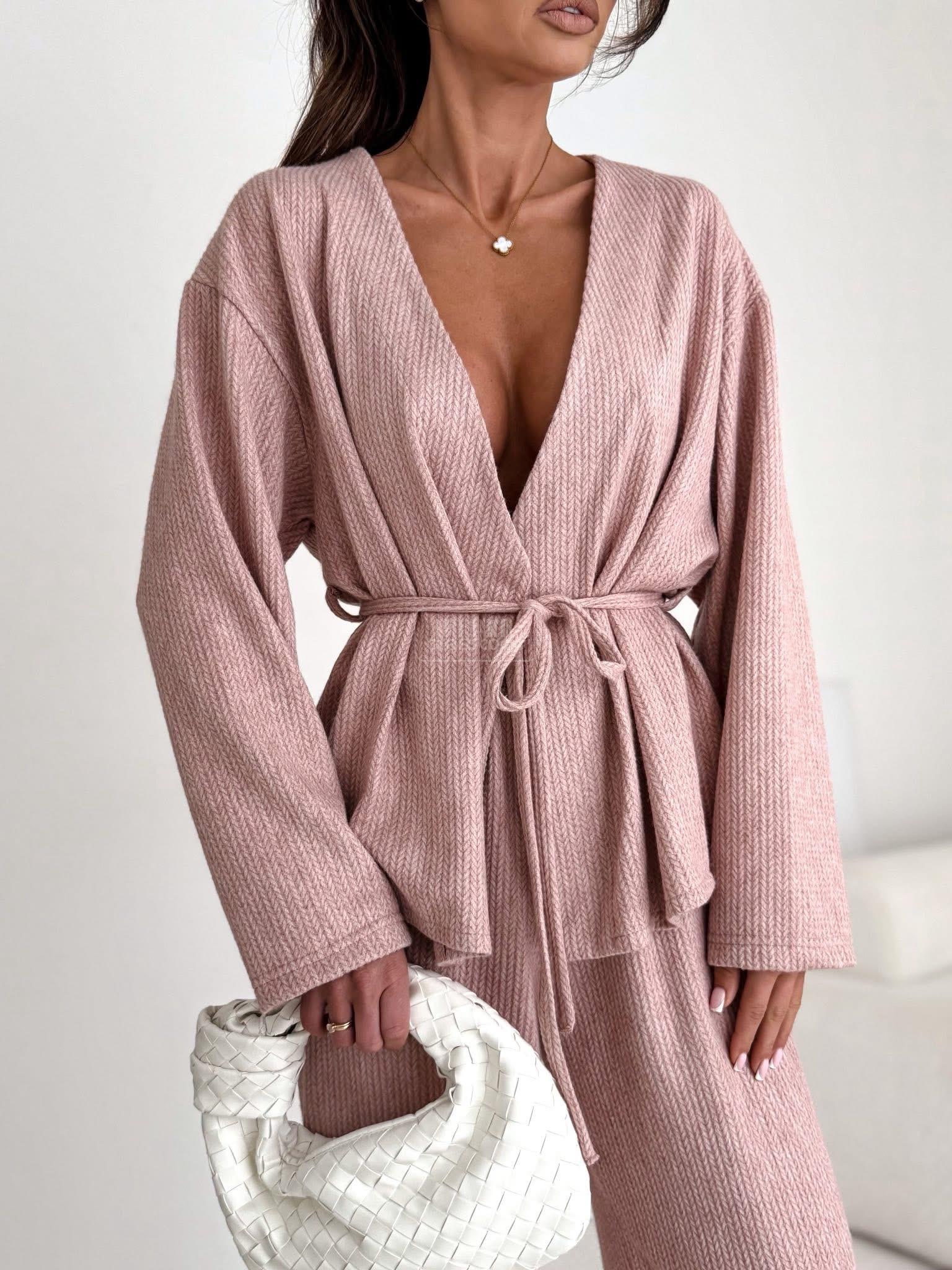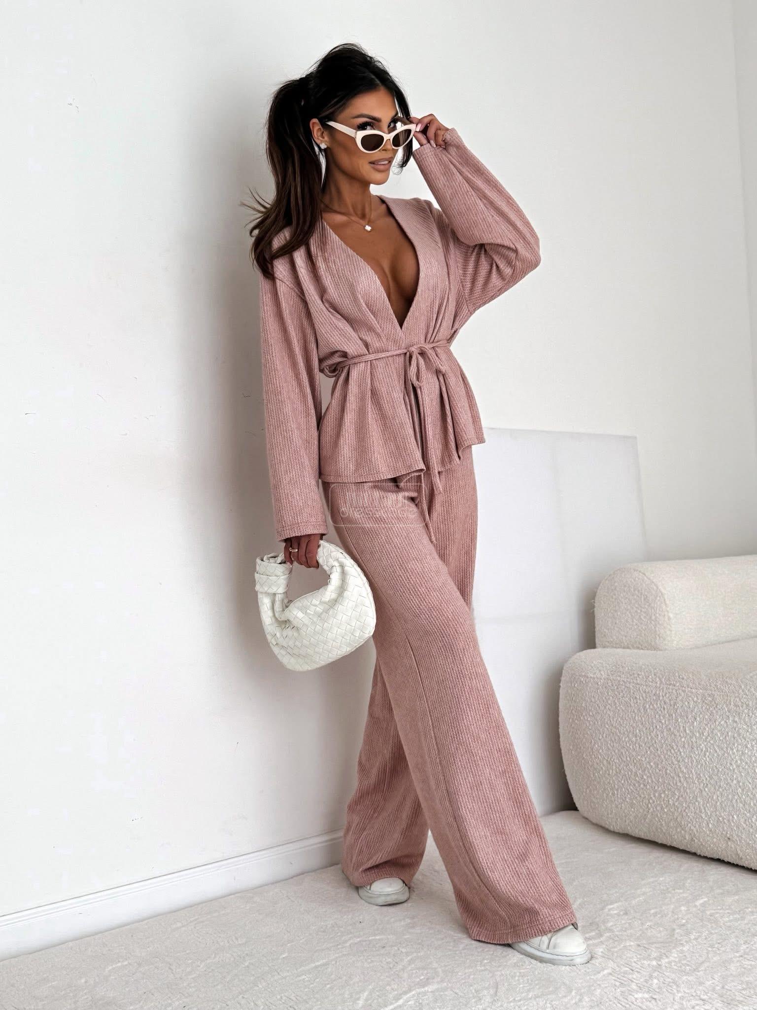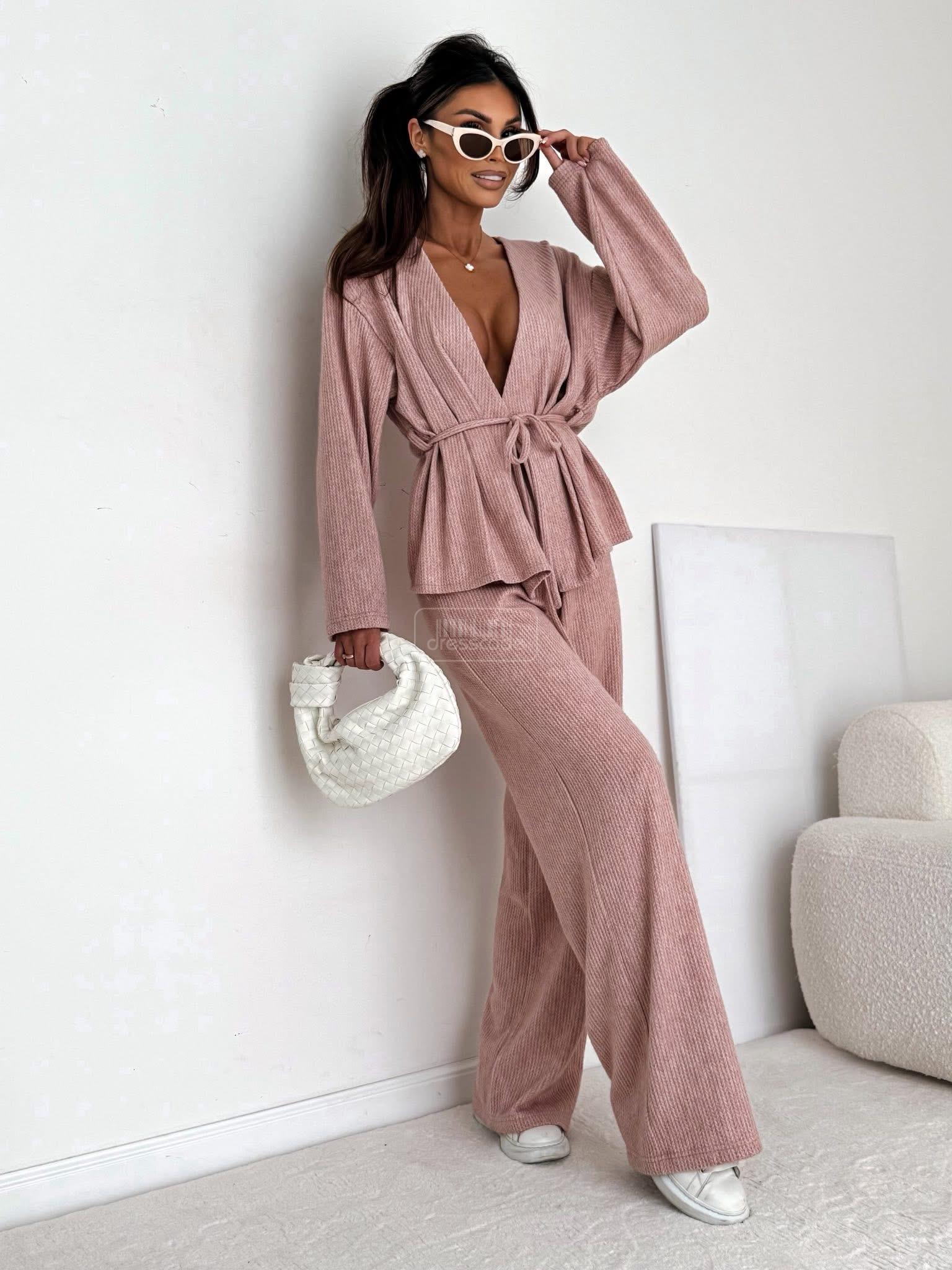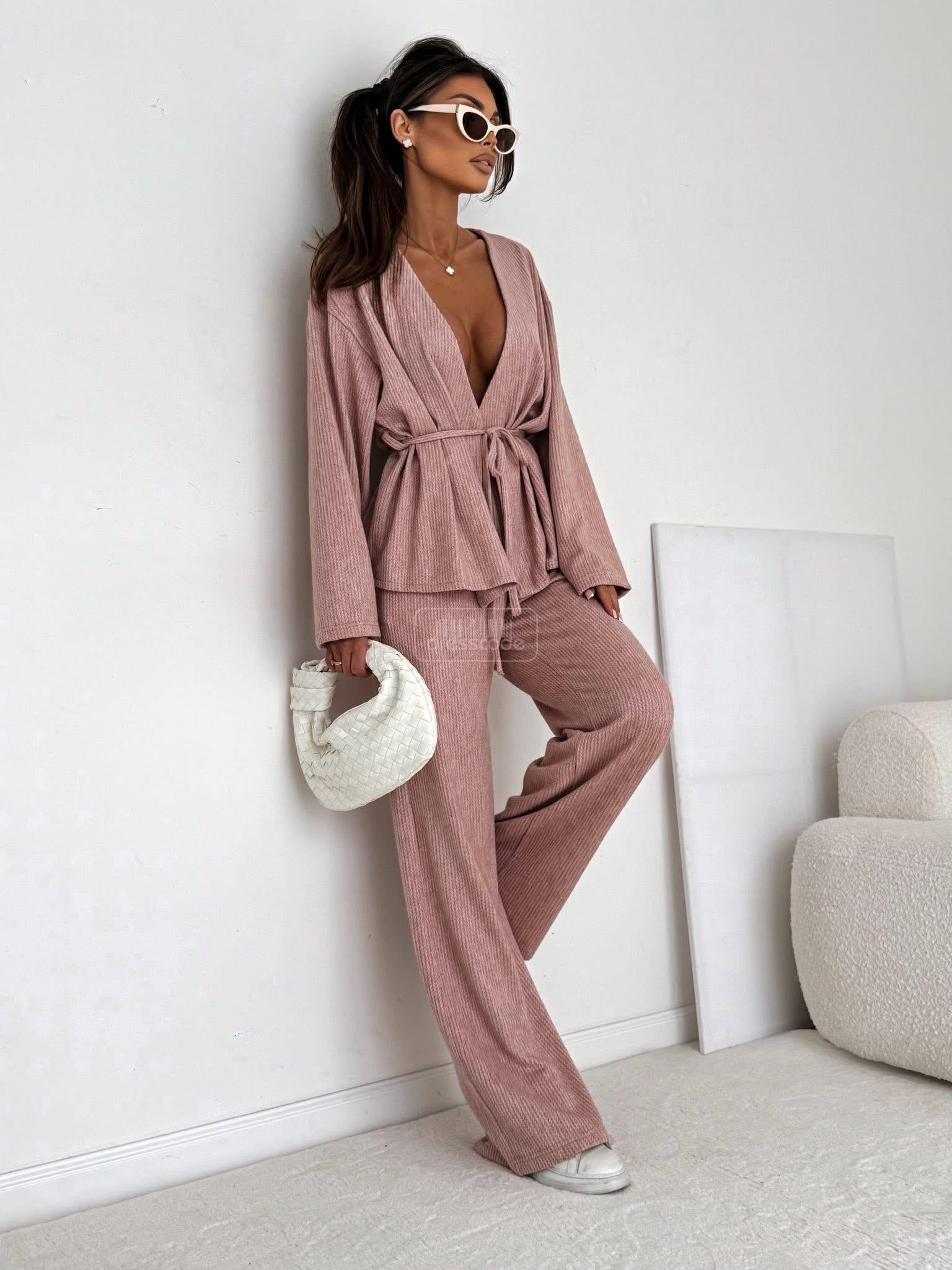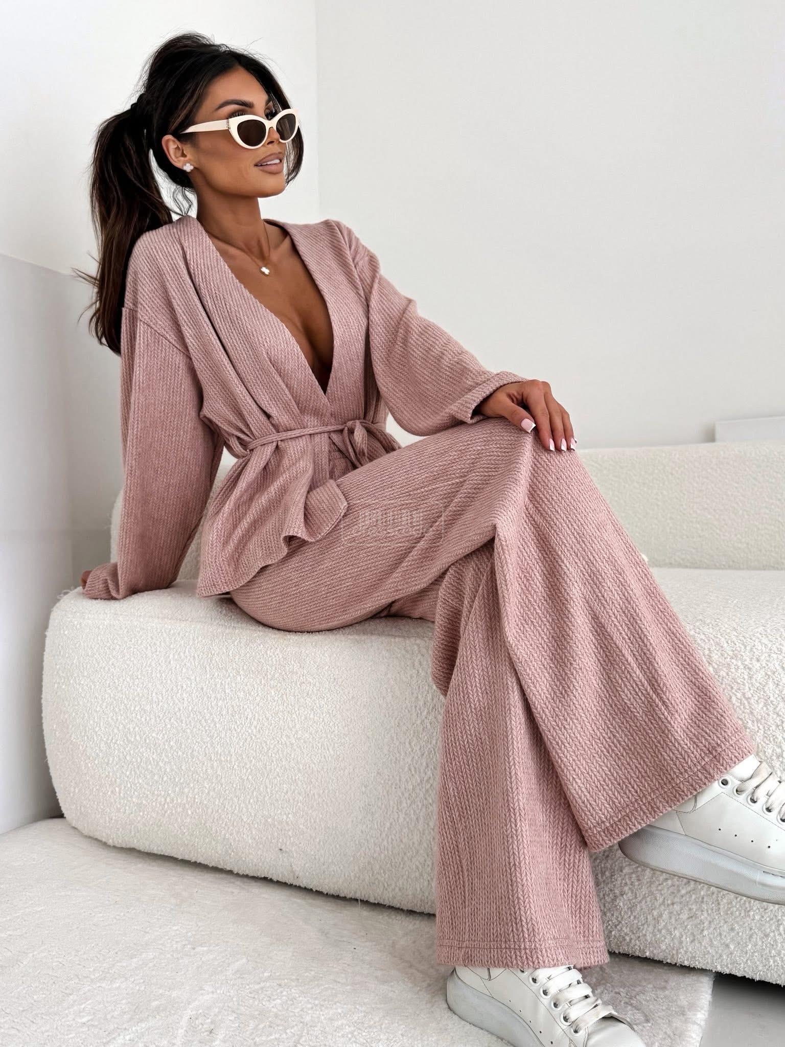 Stylový a pohodlný komplet se širokými kalhotami a zavazováním v pase – ideální pro každou příležitost. Tento přiléhavý overal kombinuje eleganci s každodenním pohodlím.