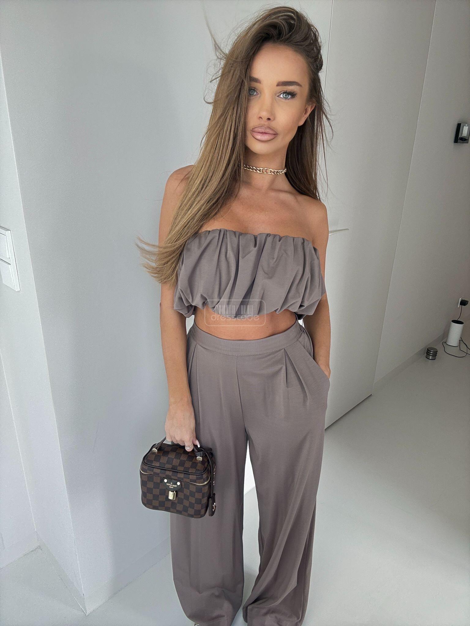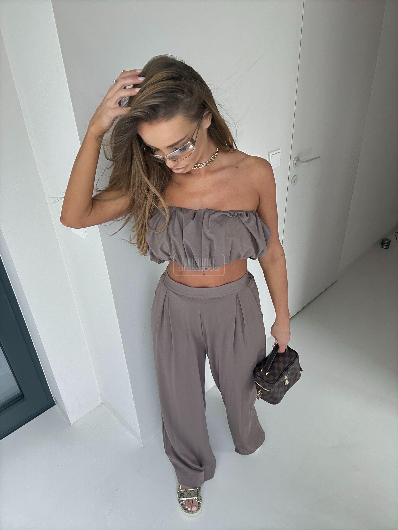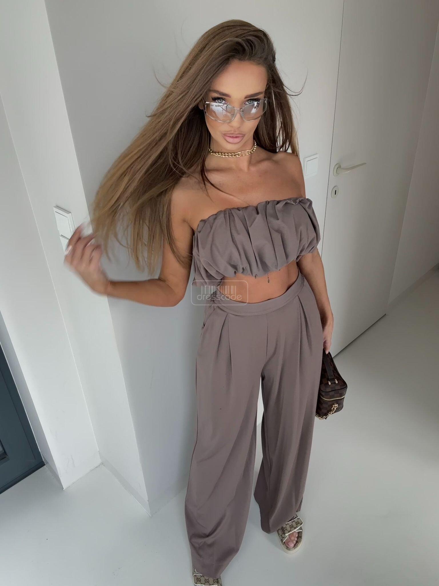 Souprava 2 v 1 je stylový, lehký a neuvěřitelně ženský outfit vyrobený z měkké, vzdušné viskózy. Zkrácený top se pyšní jedinečným, strukturovaným volánem, který mu dodává moderní nádech a krásně zvýrazňuje ramena. Kalhoty s vysokým pasem a širokými kalhotami dokonale tvarují postavu, opticky prodlužují nohy a zajišťují maximální pohodlí. Souprava Armon je ideální na léto, dovolené, setkání s přáteli a elegantní minimalistické styly. -Zkrácený top s výraznými, strukturovanými volánky