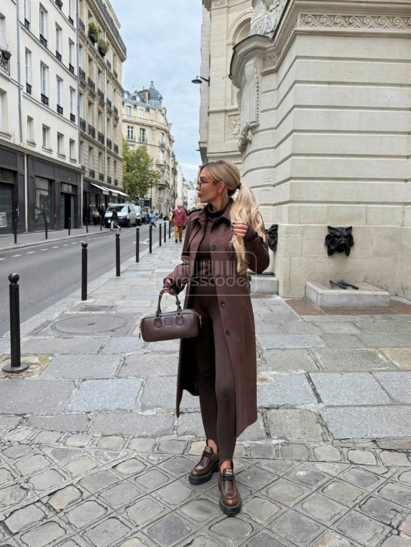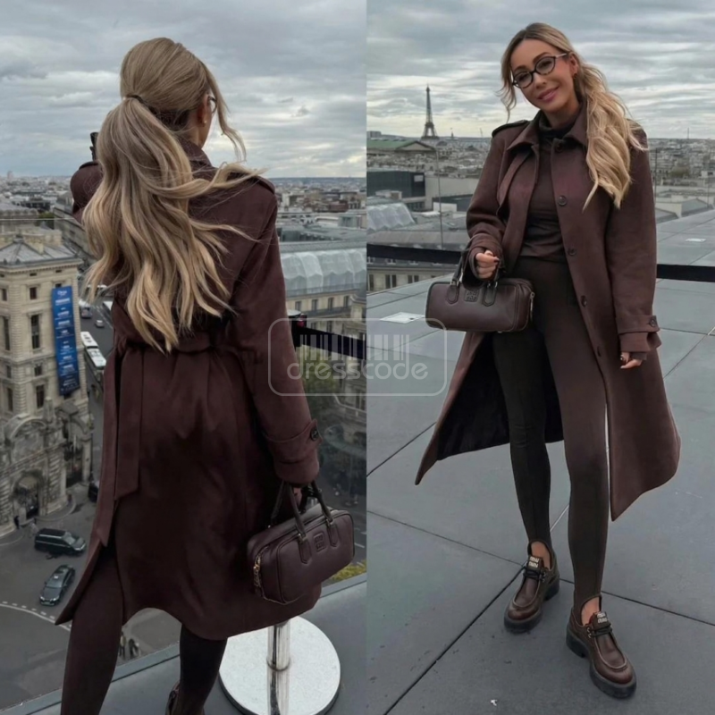 Tento semišový kabát je ztělesněním ženské klasiky s moderním nádechem. Jedinečný, měkký materiál krásně splývá a jeho minimalistický design z něj činí jednoduchý základ pro různé outfity – elegantní i ležérní.