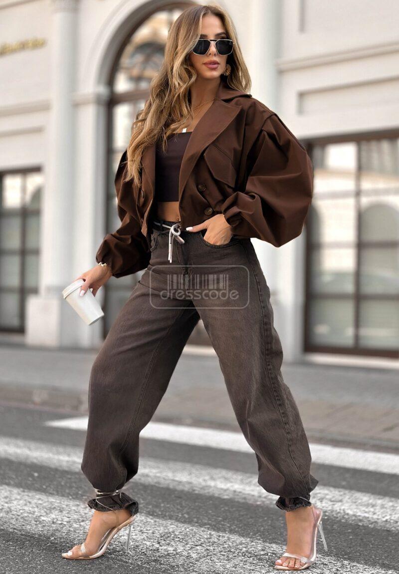 Krátká bomber bunda vyrobená z neelastické, měkké látky. Tento kousek má elastický lem a konce rukávů. Přední část má funkční kapsy s klopami a zapínání na knoflík.