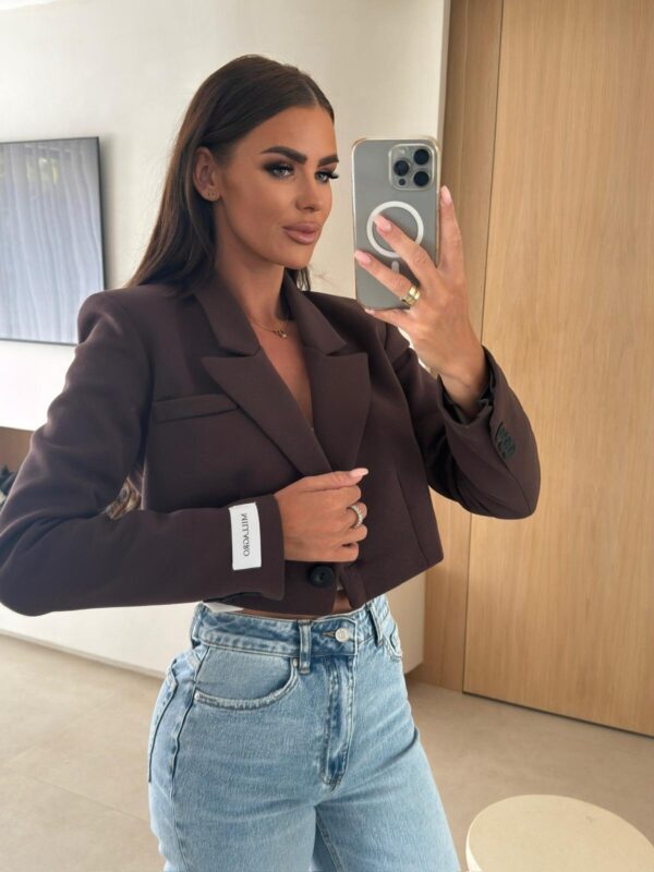 Mikinový vzhled, krátká délka. Nastavitelné zapínání na knoflíky.