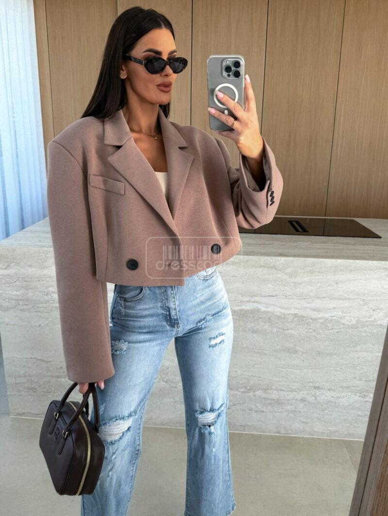 Mikinový vzhled, krátká délka. Nastavitelné zapínání na knoflíky.