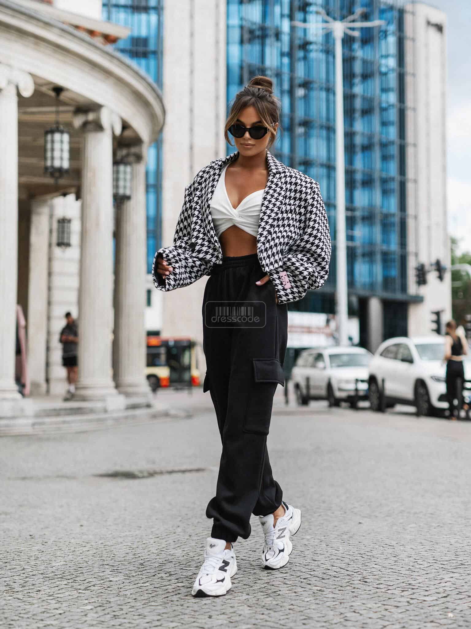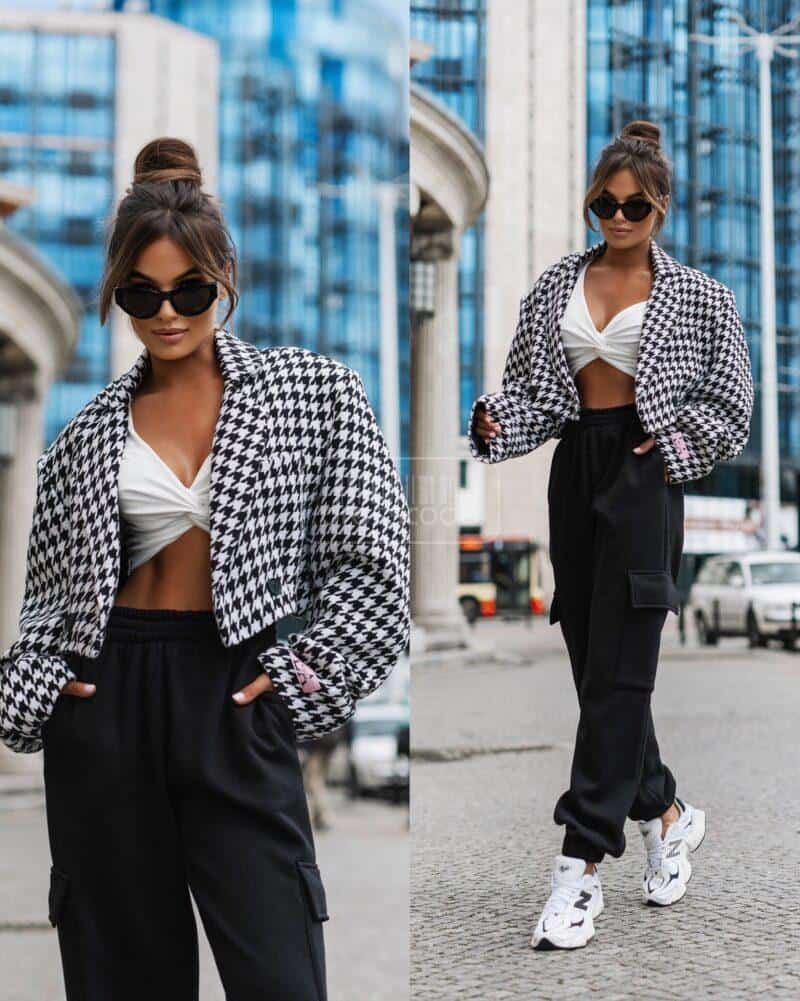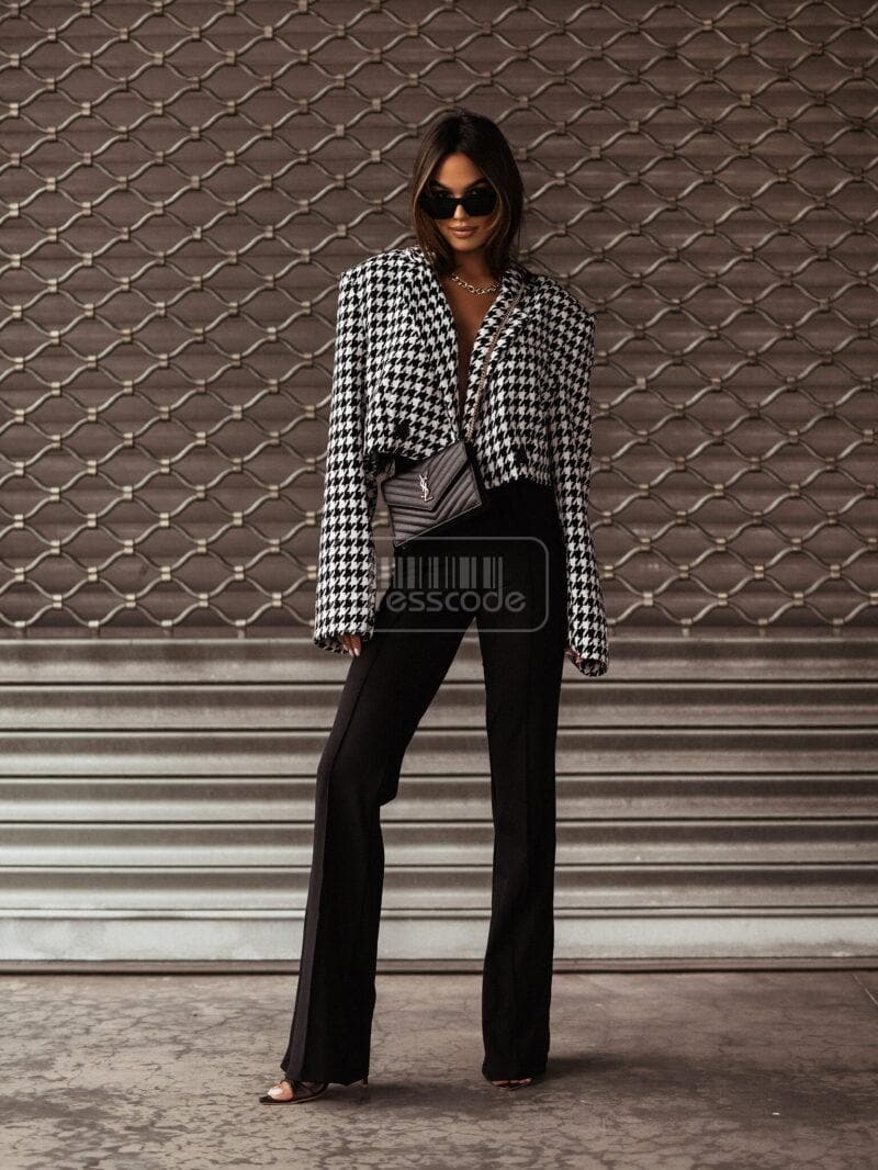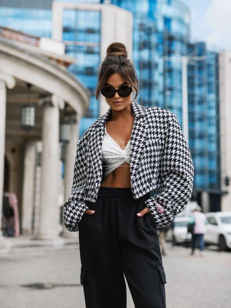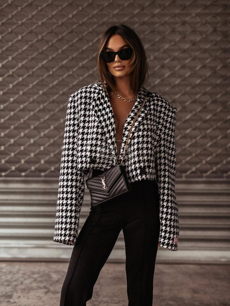 Krátká bunda v kohouté stopě je must have této sezóny. Jeho design doplní mnoho stylů. Kratší střih zvýrazní pas a zvýrazní přednosti ženské postavy. Tento model má zapínání na dva knoflíky – bude vypadat skvěle rozepnutý i zapnutý.