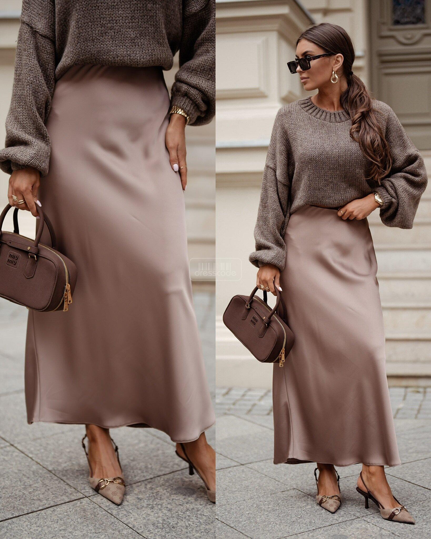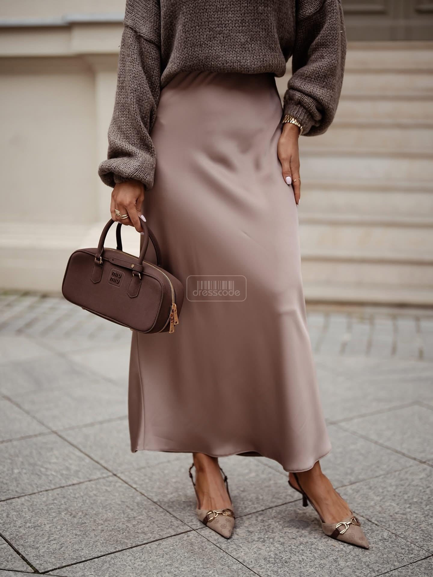 Saténový povrch, zvýrazněný pas. Vyšší střih.