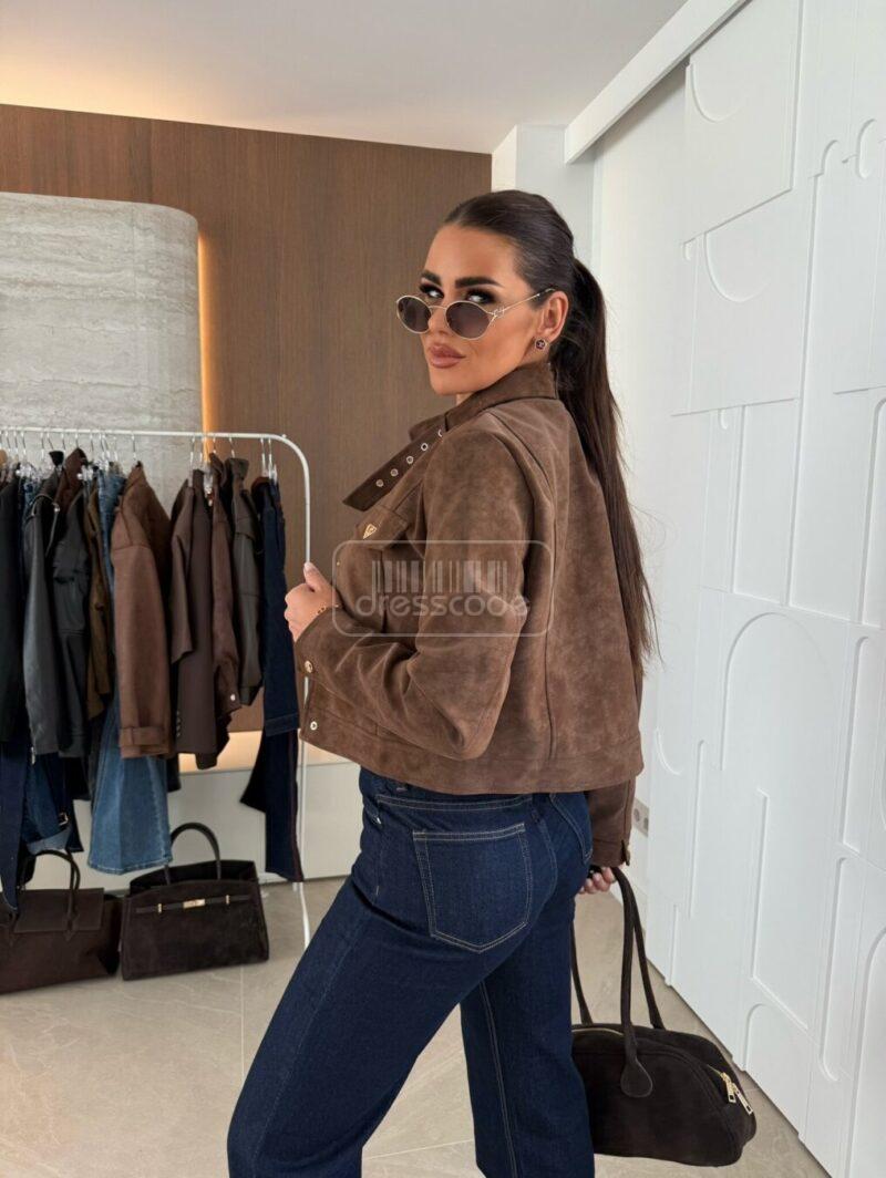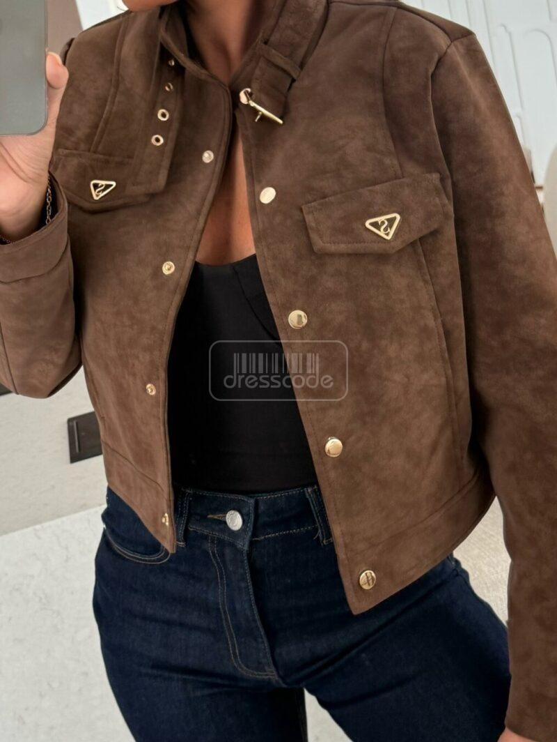 Tato dámská semišová bunda je kombinací elegance a praktičnosti. Zlaté patenty a ozdobné kapsy na hrudi dodávají klasickému designu moderní nádech.