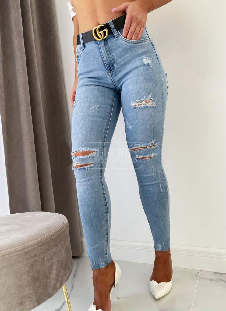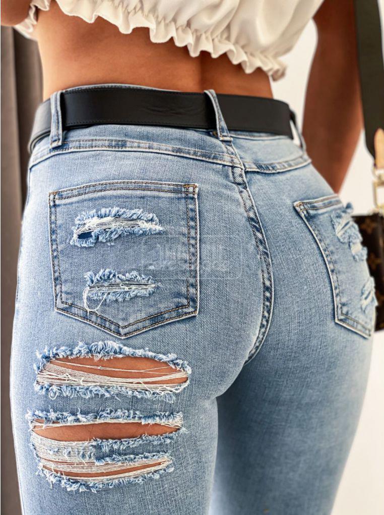 Elastické rozthané džíny jsou základem každého šatníku.  Trhání na zadku z nich činí nepřehlédnutelný kousek.  Snadno se dají zkombinovat s tílkem, svetrem či topem. Jsou ideální pro běžné nošení, do školy, do města nebo na setkání s přáteli. Krásně tvarují postavu. Rozměry sedí na standardní velikosti.