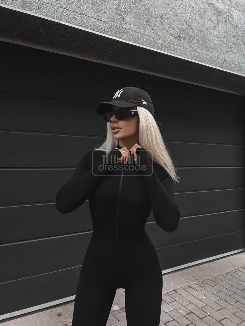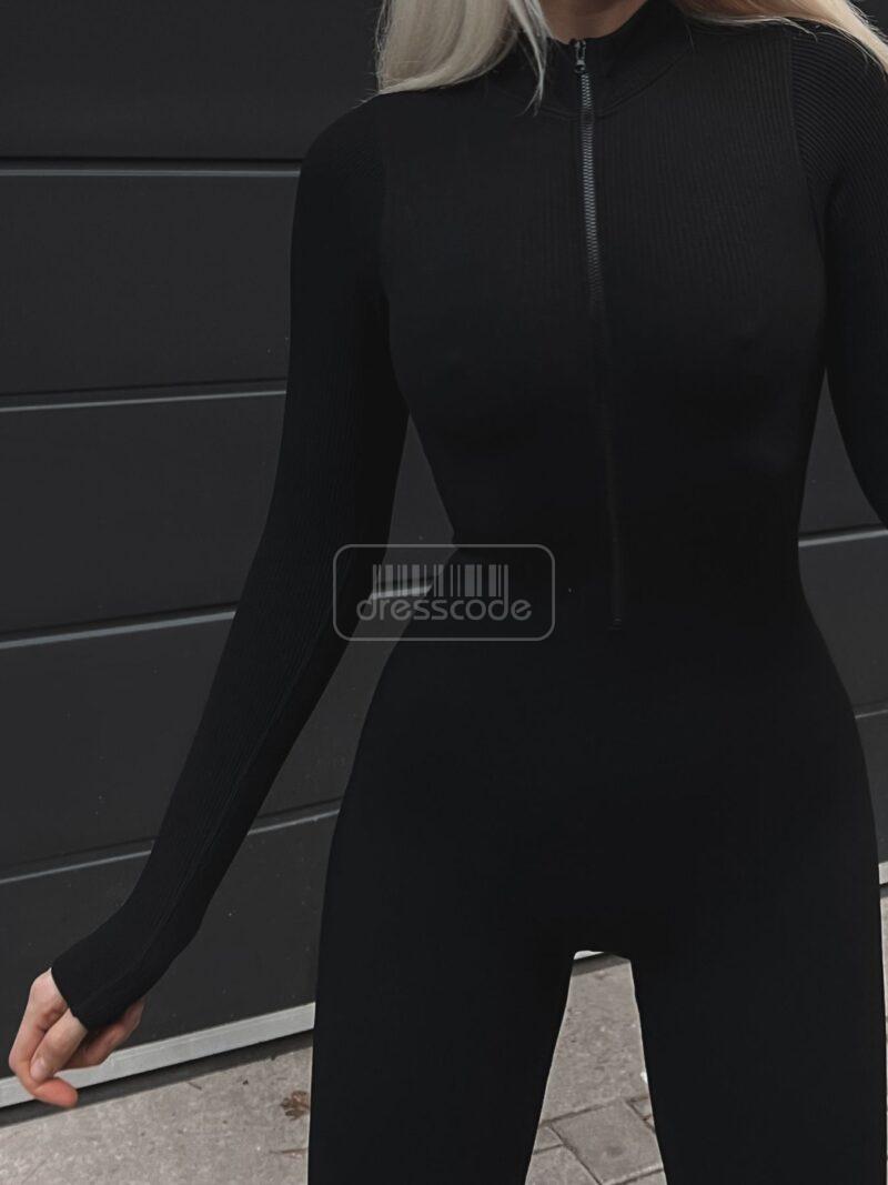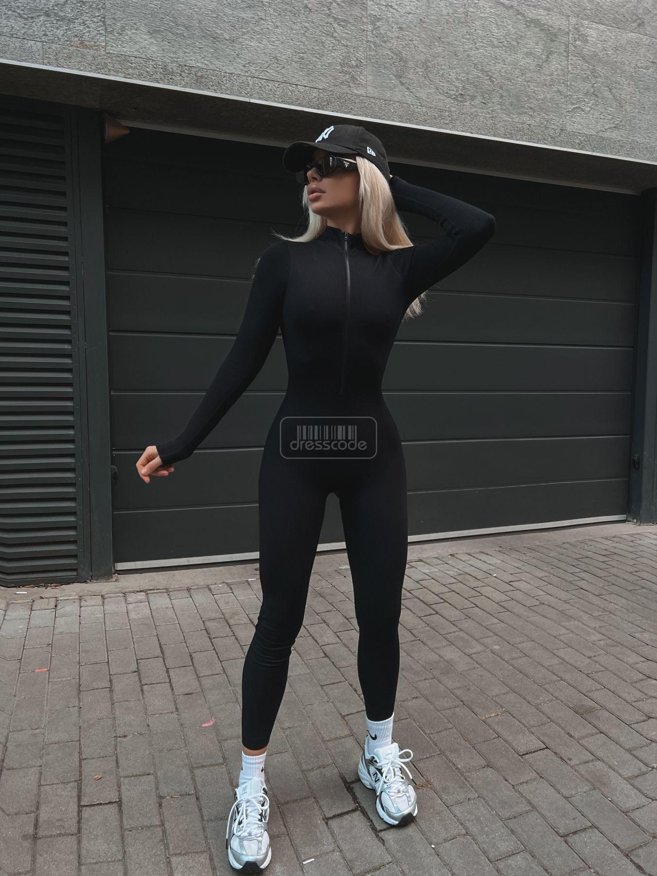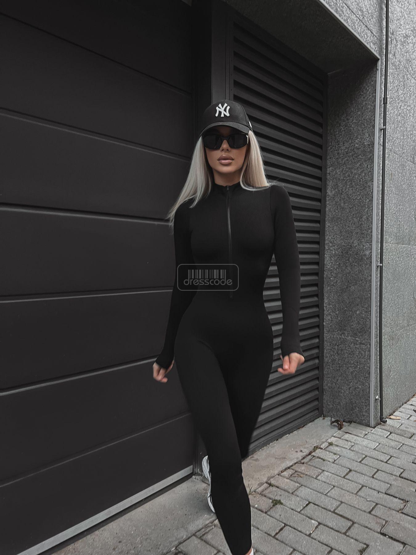 Černý overal z vroubkované látky je perfektní volbou pro vytvoření pohodlného vzhledu. Náš návrh rozhodně přiléhá k tělu, dokonale podtrhne přednosti postavy. Skvěle se bude hodit ke kotníkovým botám a kožené motorkářské bundě.