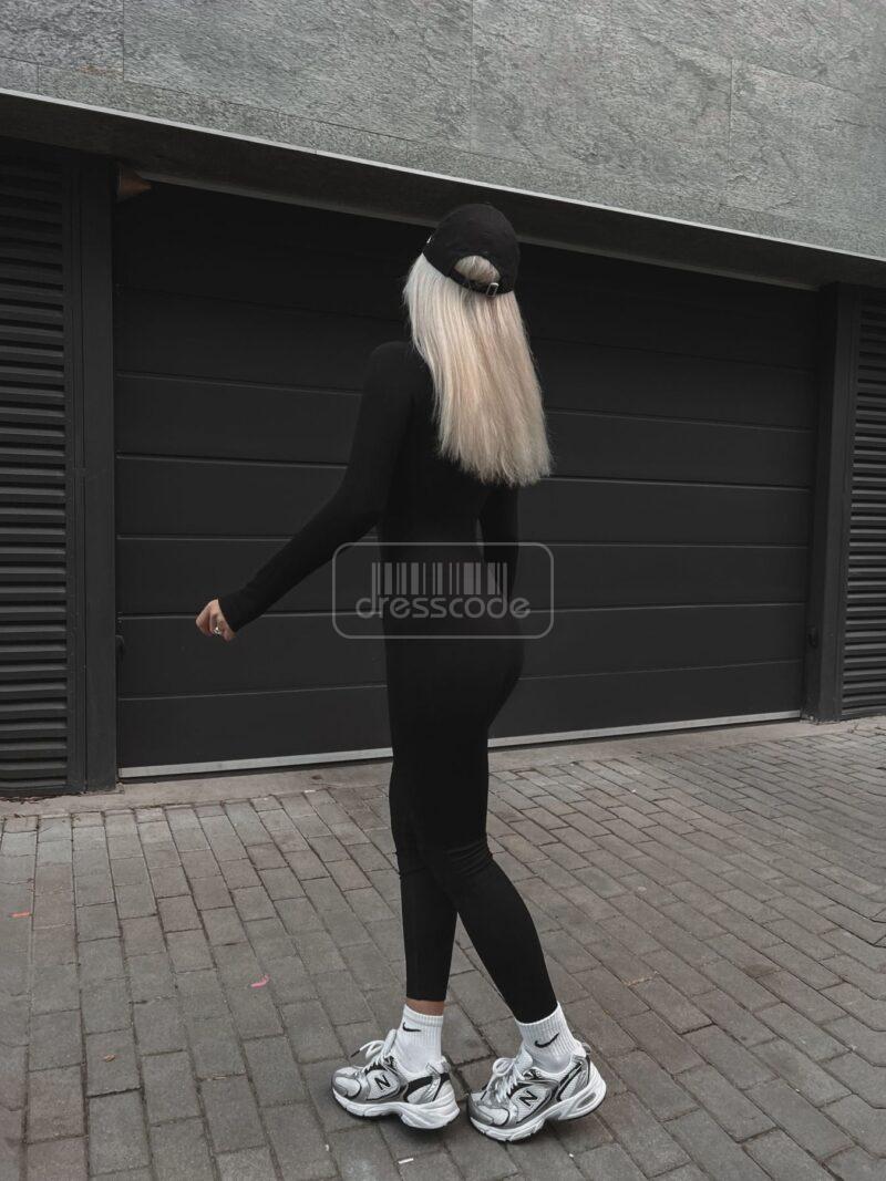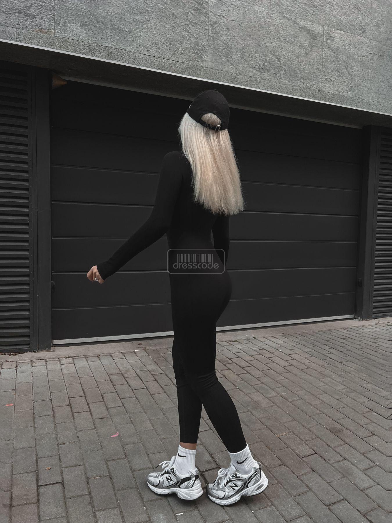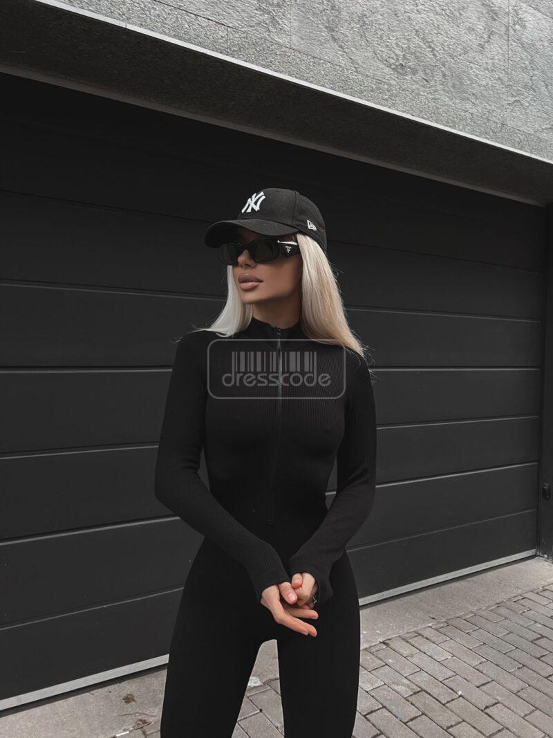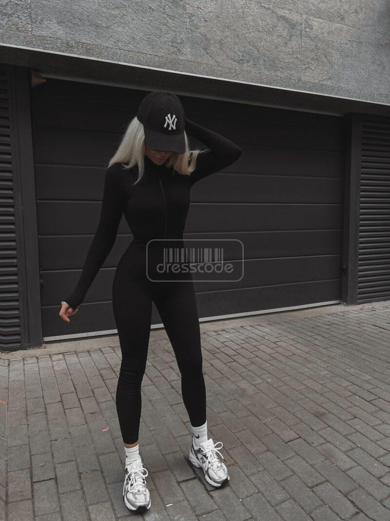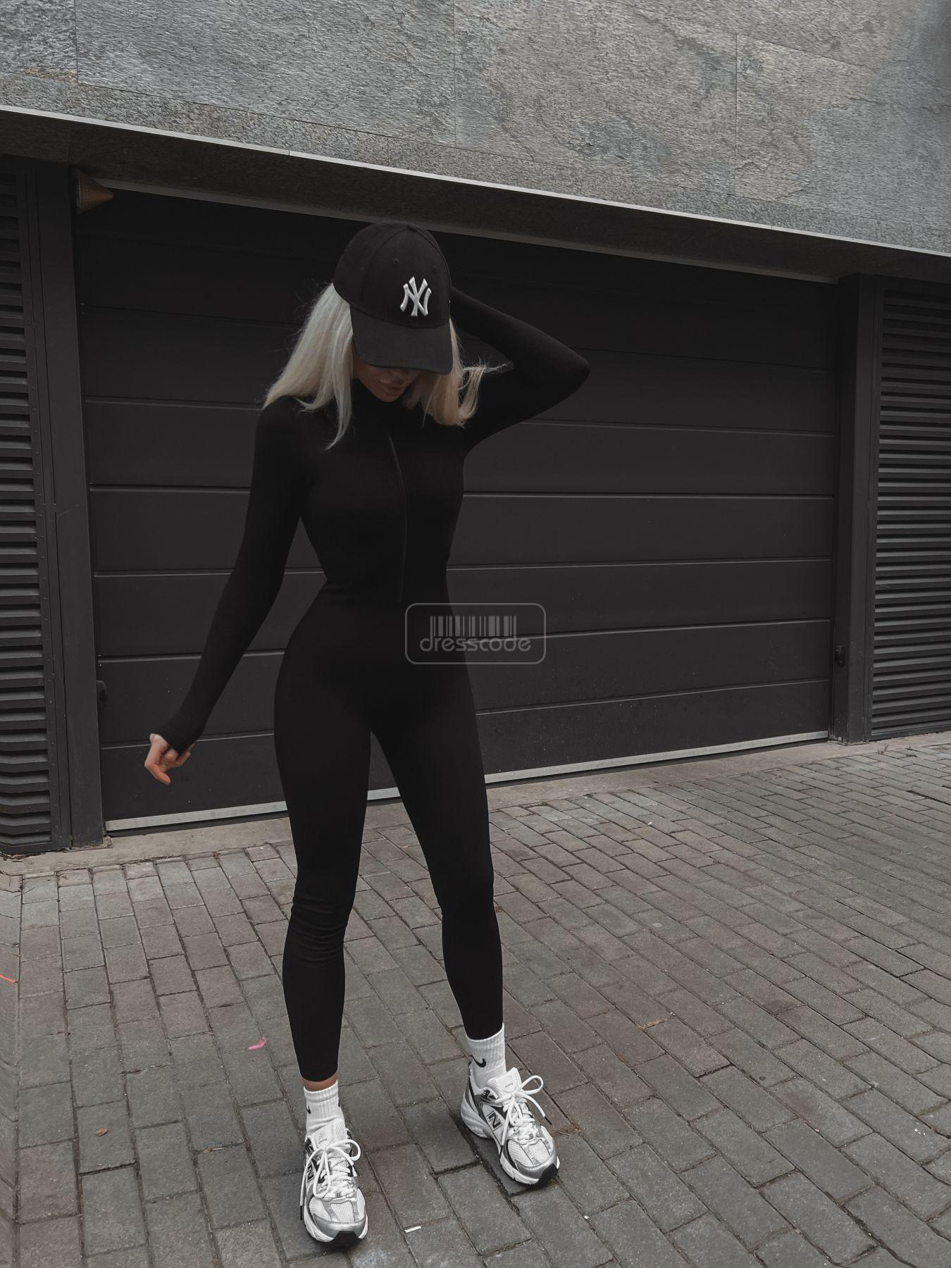 Černý overal z vroubkované látky je perfektní volbou pro vytvoření pohodlného vzhledu. Náš návrh rozhodně přiléhá k tělu, dokonale podtrhne přednosti postavy. Skvěle se bude hodit ke kotníkovým botám a kožené motorkářské bundě.