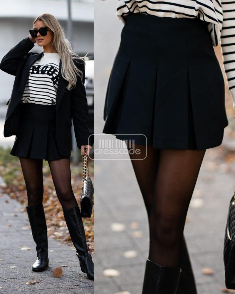 Sledujte trendy černé sukně-šortky. plisované je must have ve vašem šatníku. Jsou výborným základem pro mnoho stylů. Toto je ideální návrh pro milovníky miniatur.