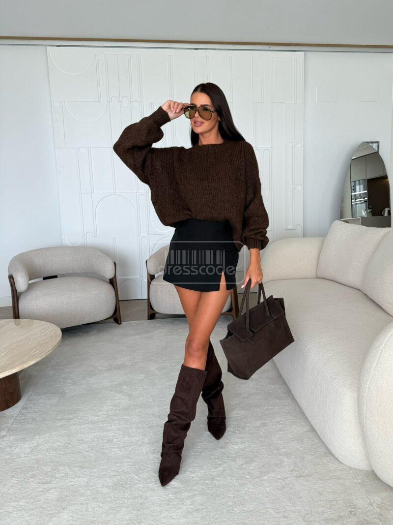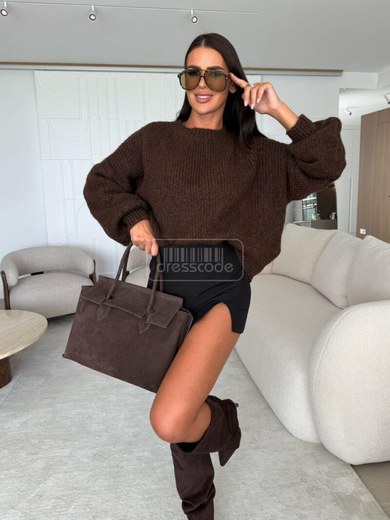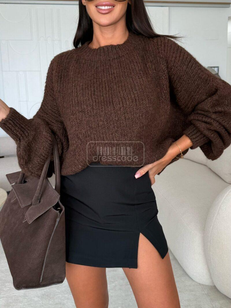 Svetr s hrubším úpletem a volnějším střihem. Nafouklé rukávy.