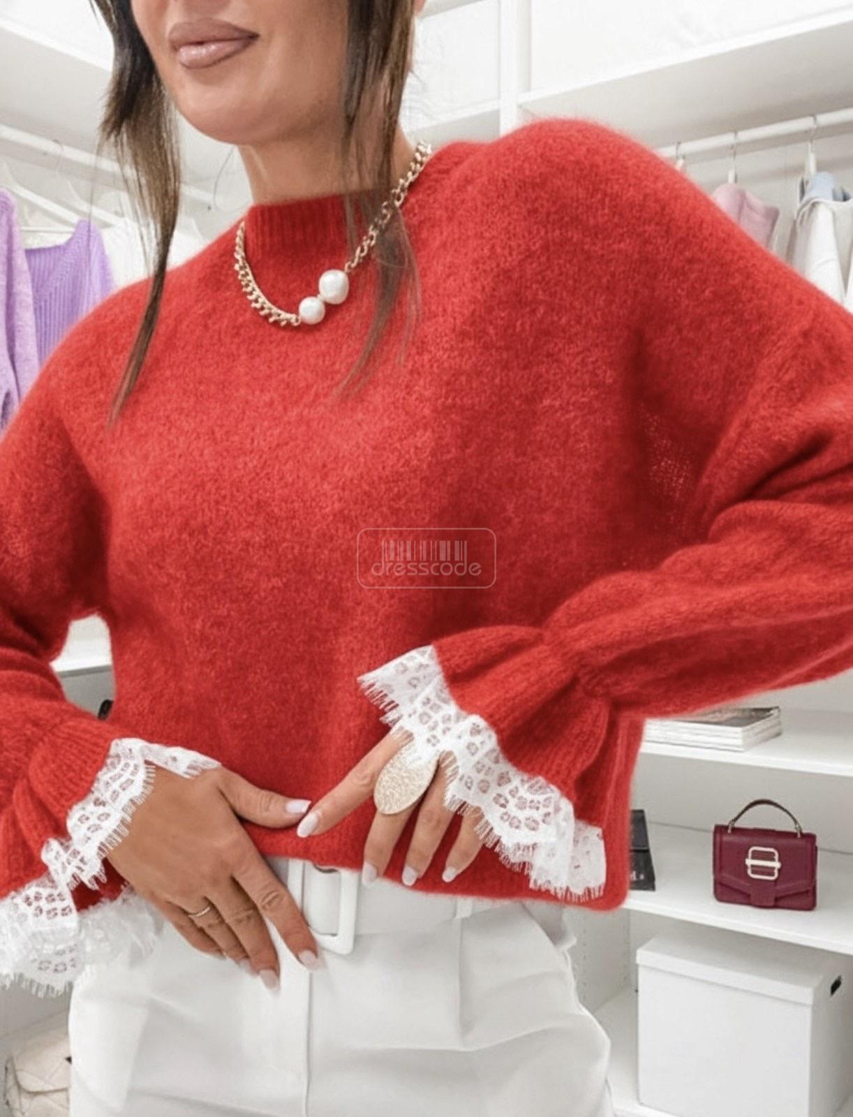 Tento mohérový svetr je skvělou volbou pro chladnější dny. Volný střih z teplého úpletu je měkký, pohodlný a lichotivý, zatímco rukávy s krajkou mu dodávají jedinečný nádech. Tento stylový mohérový svetr se dobře hodí k džínám i elegantním kalhotám.