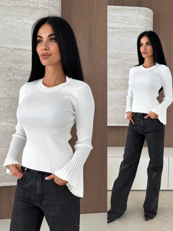 Klasický pruhovaný vzor jí dodává nadčasový charakter, zatímco dlouhé rukávy s jemným zvonkovým vzorem dodávají nádech lehkosti a elegance.