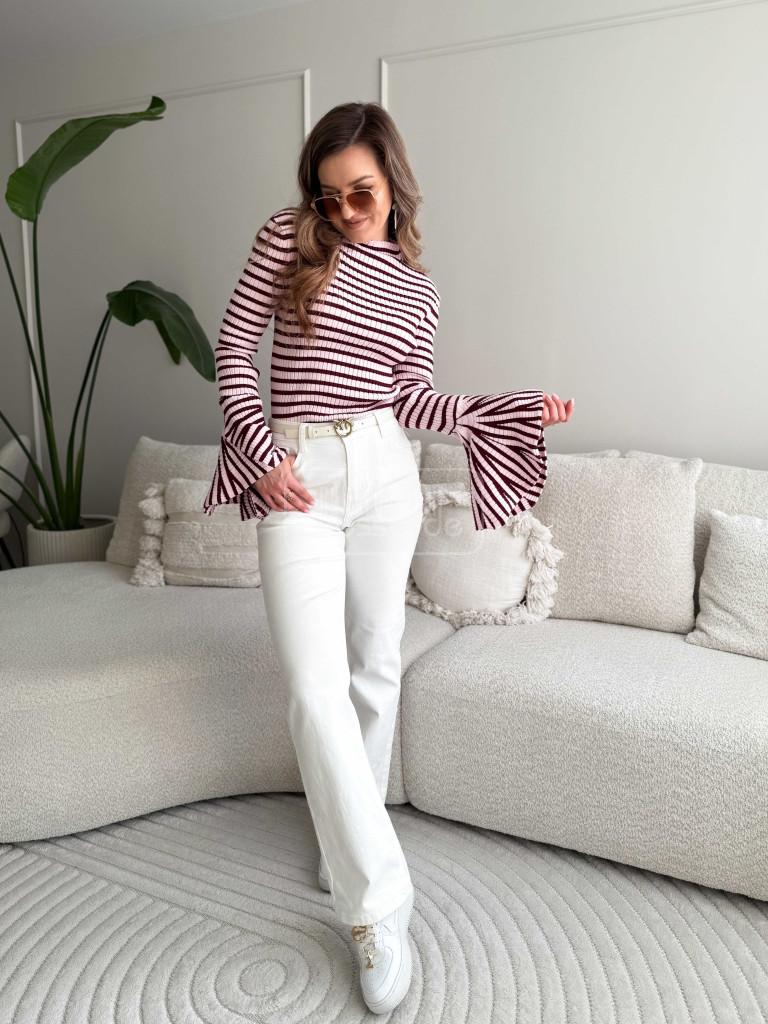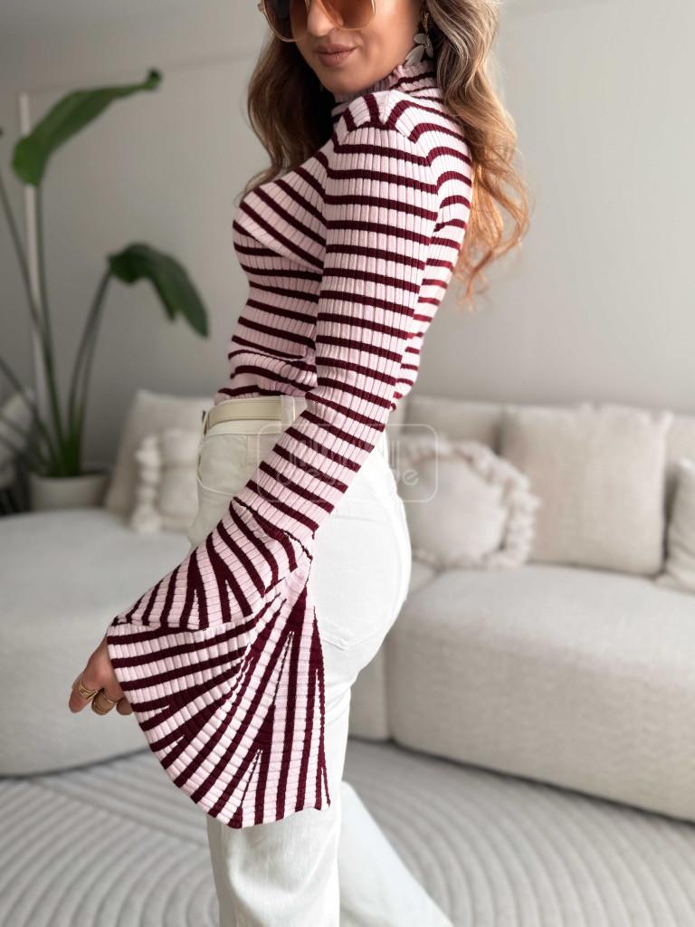 Klasický pruhovaný vzor jí dodává nadčasový charakter, zatímco dlouhé rukávy s jemným zvonkovým vzorem dodávají nádech lehkosti a elegance.