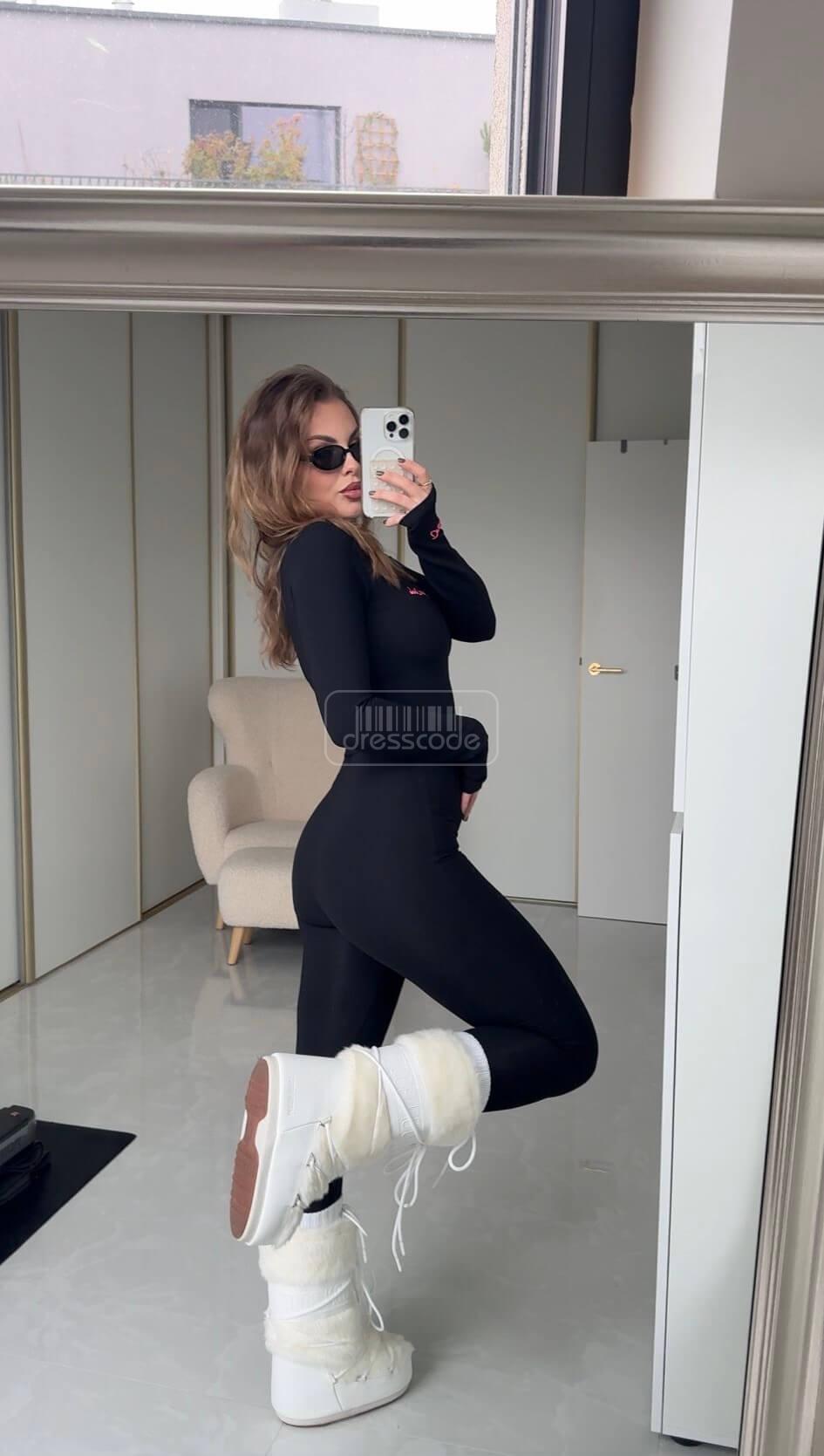 Černý overal z vroubkované látky naší značky je perfektní volbou pro vytvoření pohodlného vzhledu. Náš návrh rozhodně přiléhá k tělu, dokonale podtrhne přednosti postavy. Skvěle se bude hodit ke kotníkovým botám a kožené motorkářské bundě.